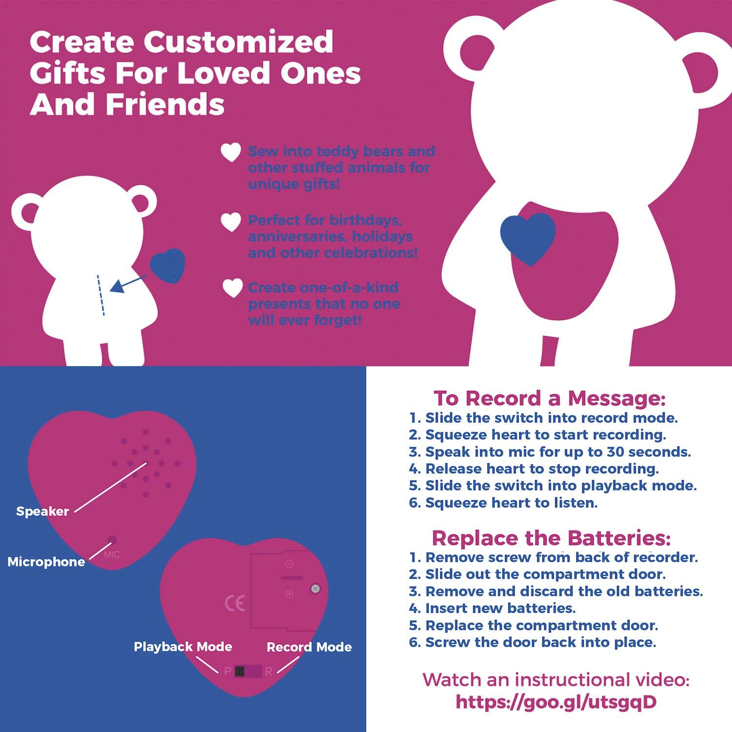- ? EASY OPERATION – Turn the switch to record mode; squeeze and hold while recording your message. Turn the switch to playback mode; squeeze once to play back your message. We include an instruction manual and how to video.