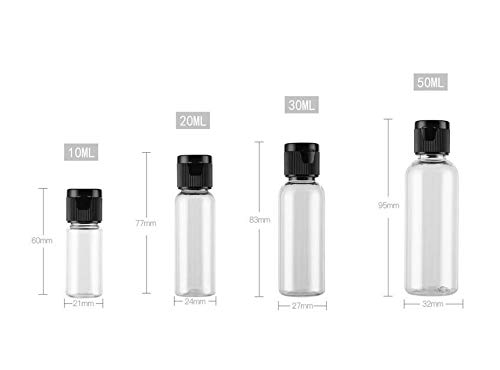 - INFORMATION – material:Hard Plastic,can’t Squeeze;Color:Clear bottle with black cap;Capacity:10ml,20ml,30ml and 50ml for you choose ;Size:10ml:60x21mm/2.4″x0.8″;20ml:65x23mm/2.6″x0.9″;30ml:84x27mm/3.3″x1.1″;50ml:95x32mm/3.7″x1.3″;Package content:12Pcs squeeze bottle