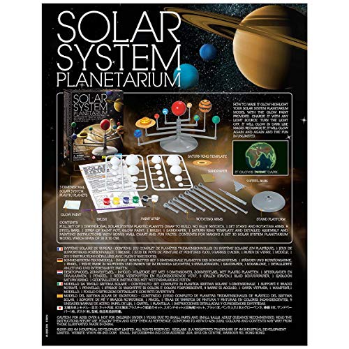 Art and science combine with the 4M Solar System Planetarium. The Solar System Planetarium set teaches children about the wonders of the solar system. Just assemble, paint and learn. This set includes planets, stencils, squeeze glow paint pen, rods, string, a fact filled wall chart and 10 sets of Kidz Quiz questions. Complete assembly instructions included. No batteries required. Recommended for ages 8 years and up.
