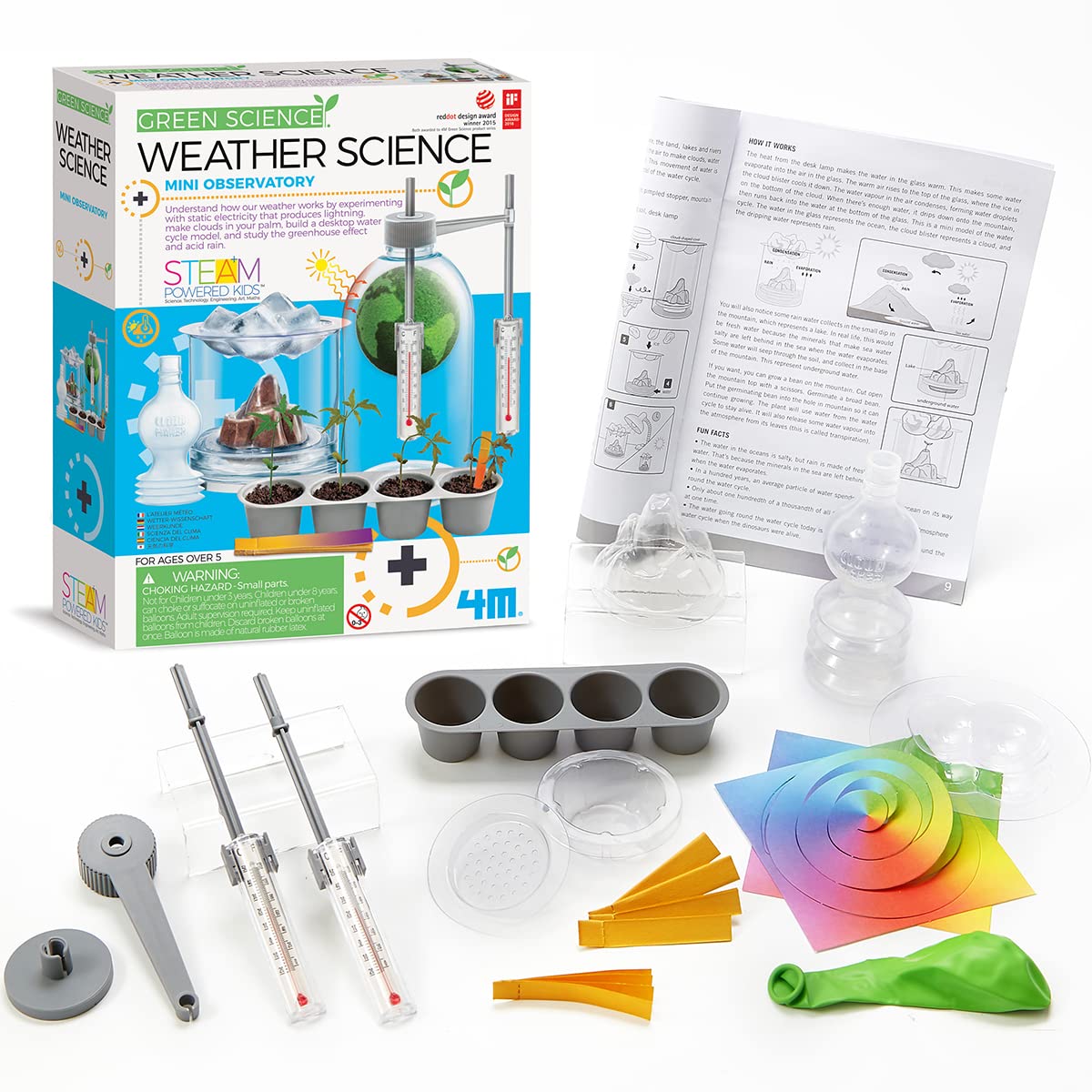 The 4M Weather Station Kit contains all the tools a young meteorologist needs to study the effects of weather on the environment. This multi-function weather kit contains a full set of basic tools to observe and record weather conditions around the home. The kit includes a functional wind vane, an anemometer, a thermometer and a rain gauge for measuring local weather conditions. Use the kit and a recycled soda bottle to create a terrarium to study the greenhouse effect on plants. Fully assembled, the weather station measures 8.5-inches by 4.75-inches, making it ideal for sitting on a desktop or bookshelf. Recommended for ages 8 years and up.