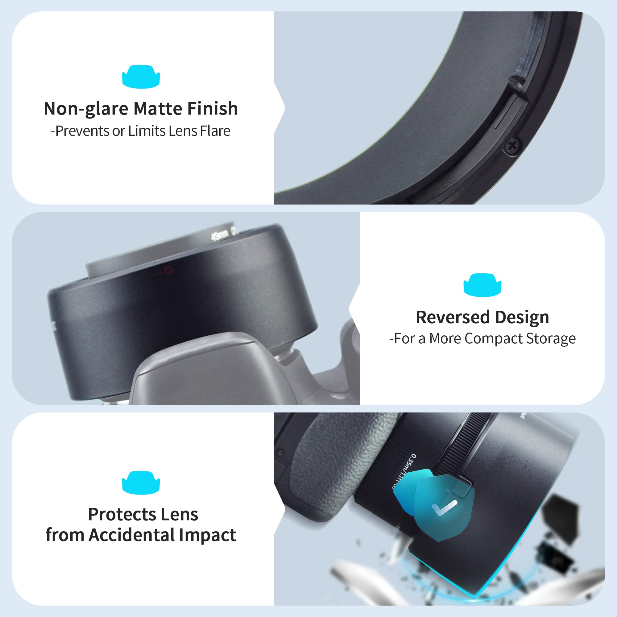 • Professional Design: Non-glare matte finish on the interior surface to further prevent or limit lens flare. No vignetting with the hood on.