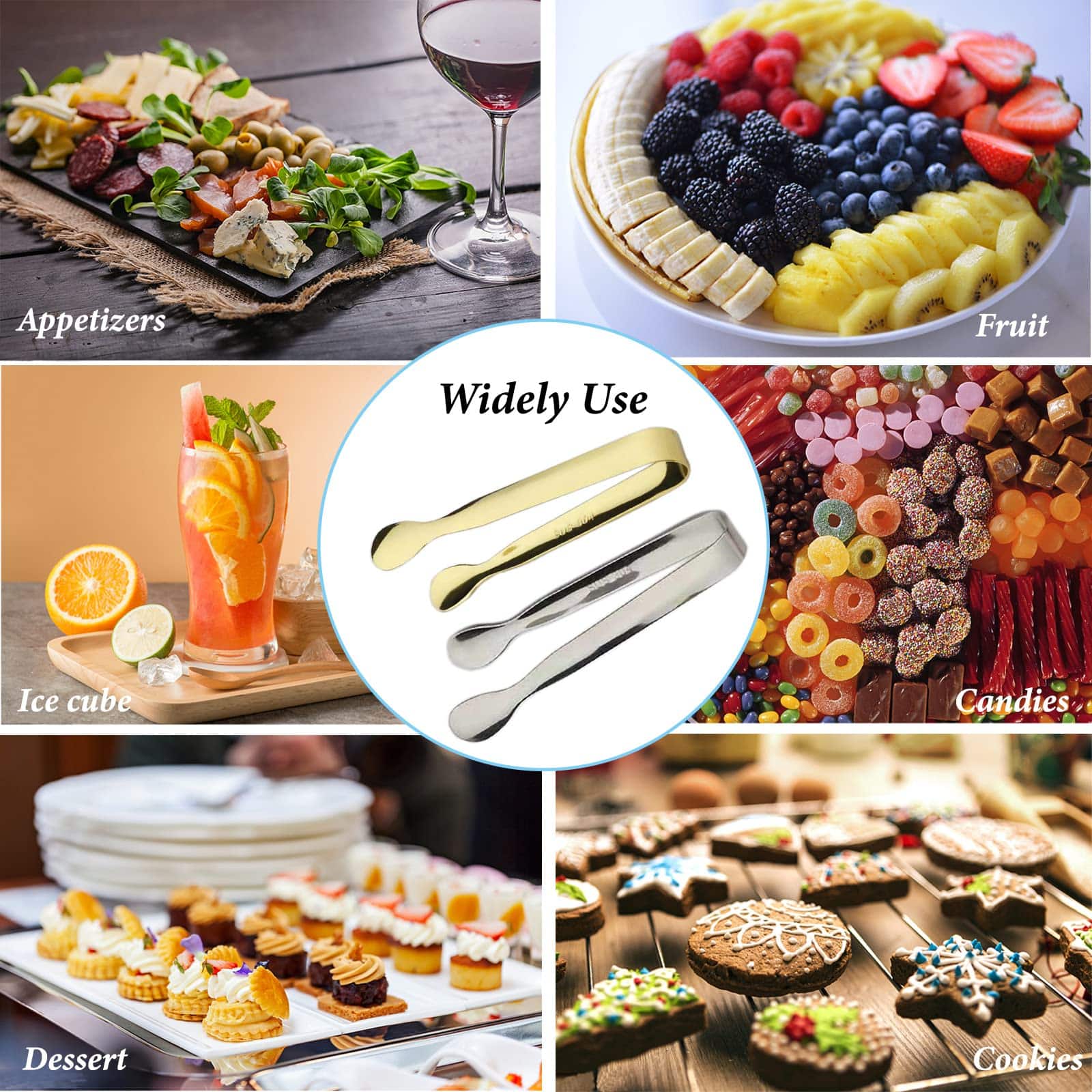- ?Application Occasion?Tiny tongs are perfect for sugar cubes, buffet, salad, appetizers. Kids tongs are good for tea party, coffee bar, which can easier pick up all kinds of small size food for ice cube, candy, bacon, fruit, chips, popcorn, appetizers, olives, etc.