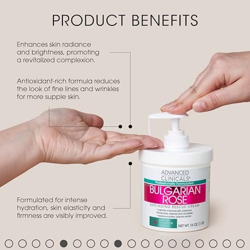 Advanced Clinicals Bulgarian Rose Oil Cream is a necessary addition to your daily skin regimen if you struggle with age-showing symptoms such as wrinkles, age spots, sun spots, acne scars, and dry skin. Rose oil is a tissue regenerator loaded with therapeutic benefits for the skin. This spa size cream from Advanced Clinicals can be used as your everyday face cream but is large enough to be used as a body moisturizer. This hydrating cream is great for your face and can be applied after using your favorite Advanced Clinicals Face Serum. This cream features Bulgarian rose oil paired with collagen, which is great for plumping and firming skin.