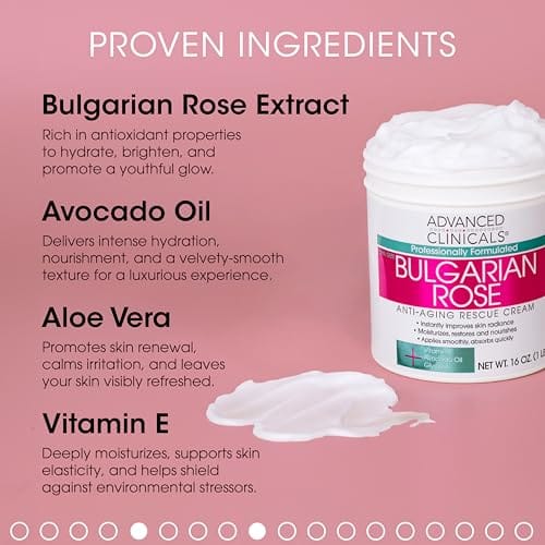 - EFFECTIVE INGREDIENTS ? Advanced Clinicals Bulgarian Rose Cream is formulated with the perfect combination of effective anti-aging ingredients, including Vitamin E Oil, Glycerin, Avocado Oil, Aloe Vera, Gotu Kola, & Green Tea Extract, which all work together to nourish, hydrate, & repair your skin for a healthier, fuller, & younger appearance. Vitamin E, Avocado Oil, & Glycerin all act as an emollient and moisturizer that keeps your skin not only moist, but soft to the touch.
