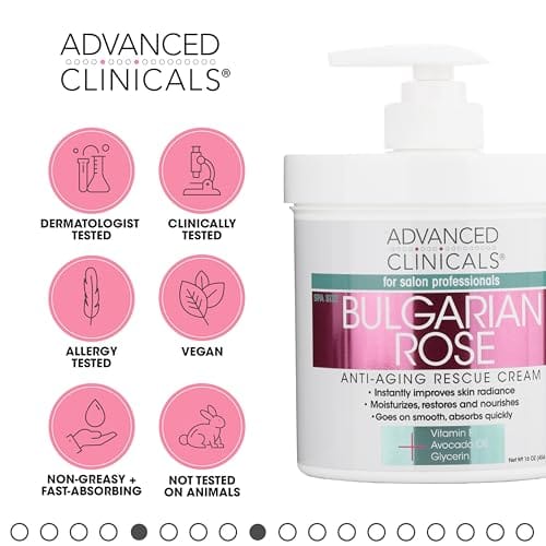- RENEW & RESTORE ? Dermatologist-Tested, Allergy-Tested, Clinically-Tested, Cruelty-Free, & PH Balanced Formula. Free From: Parabens, Drying Alcohols, Animal-Derived Ingredients, PEGs, Sulfates, Dyes, & Talc. Manufactured in our FDA-Regulated & Inspected Laboratory in Chicago, USA. We are confident that you’ll love the way this Advanced Clinicals Bulgarian Rose Anti Aging Cream makes your skin look and feel, and we stand behind our product with a satisfaction-guarantee.