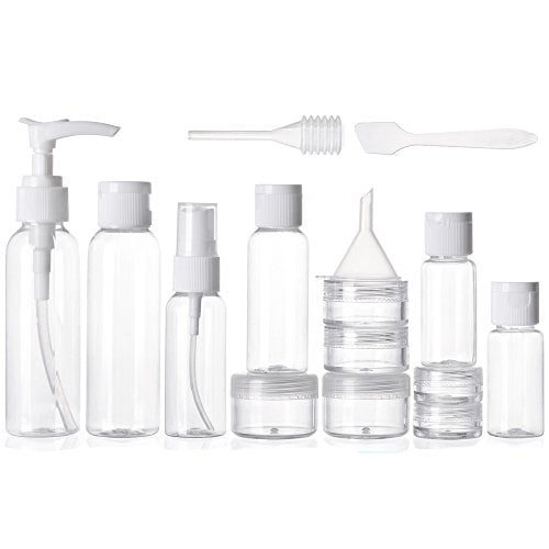 - VARIETY OF BOTTLES TO MEET DIFFERENT NEEDS – one 60ml (2 oz. ) pump bottle, one 60ml (2 oz. ) flip-cap bottle, one 30ml (1 oz. ) spray bottle, one 30ml (1 oz. ) flip-cap bottle, one 15ml (0. 5 oz.) flip-cap bottle, one 30ml squeeze bottle, two 0. 5 oz. cream jars, two 0. 35 oz. cream jars, two 0. 1 oz. cream jars, one pipette, one funnel, one spatula, one zip pouch