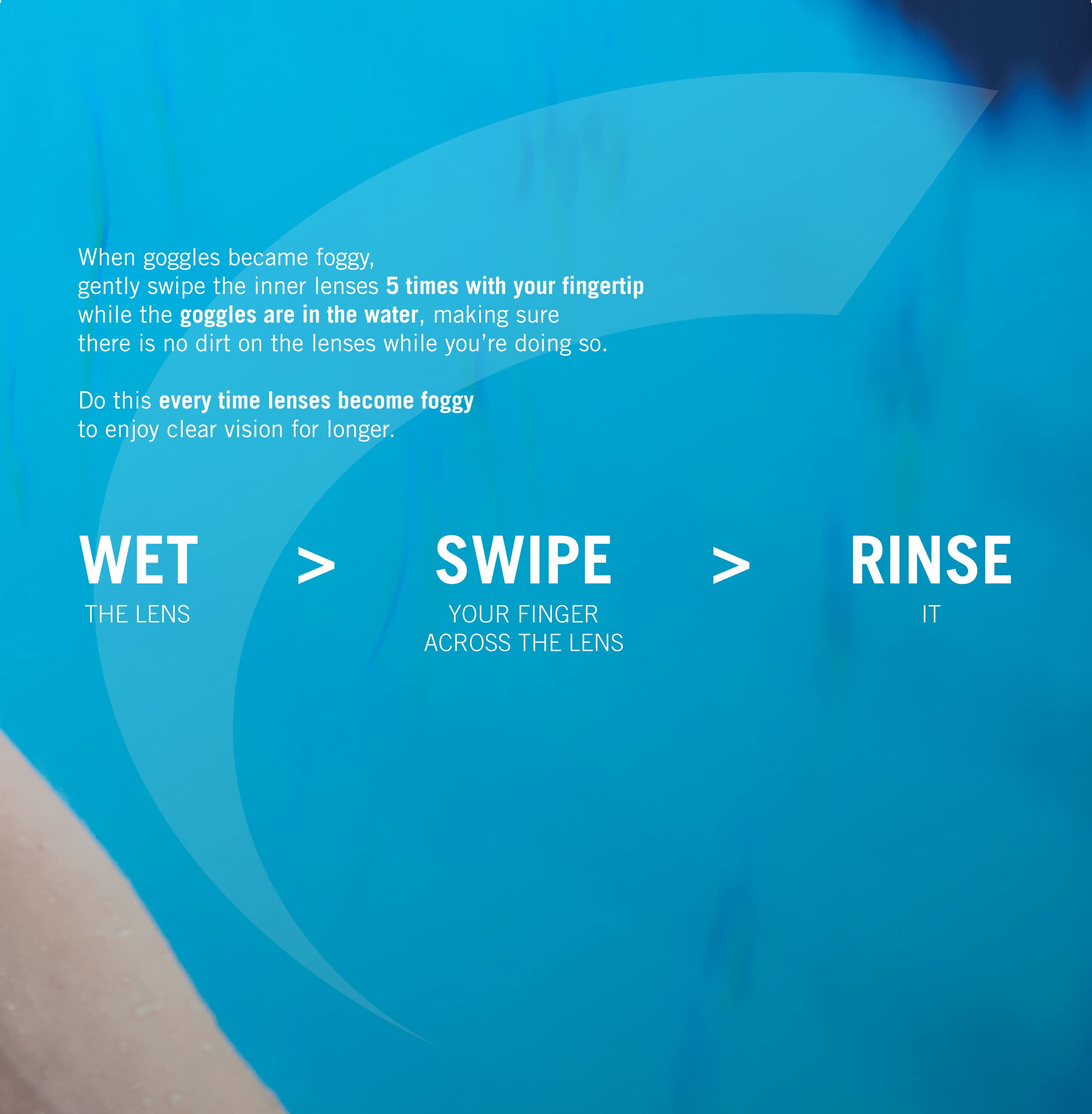 - When swim goggles become foggy, activate the revolutionary Swipe anti-fog protective film by gently swiping the inner lenses five times with your fingertip while the goggles are in the water