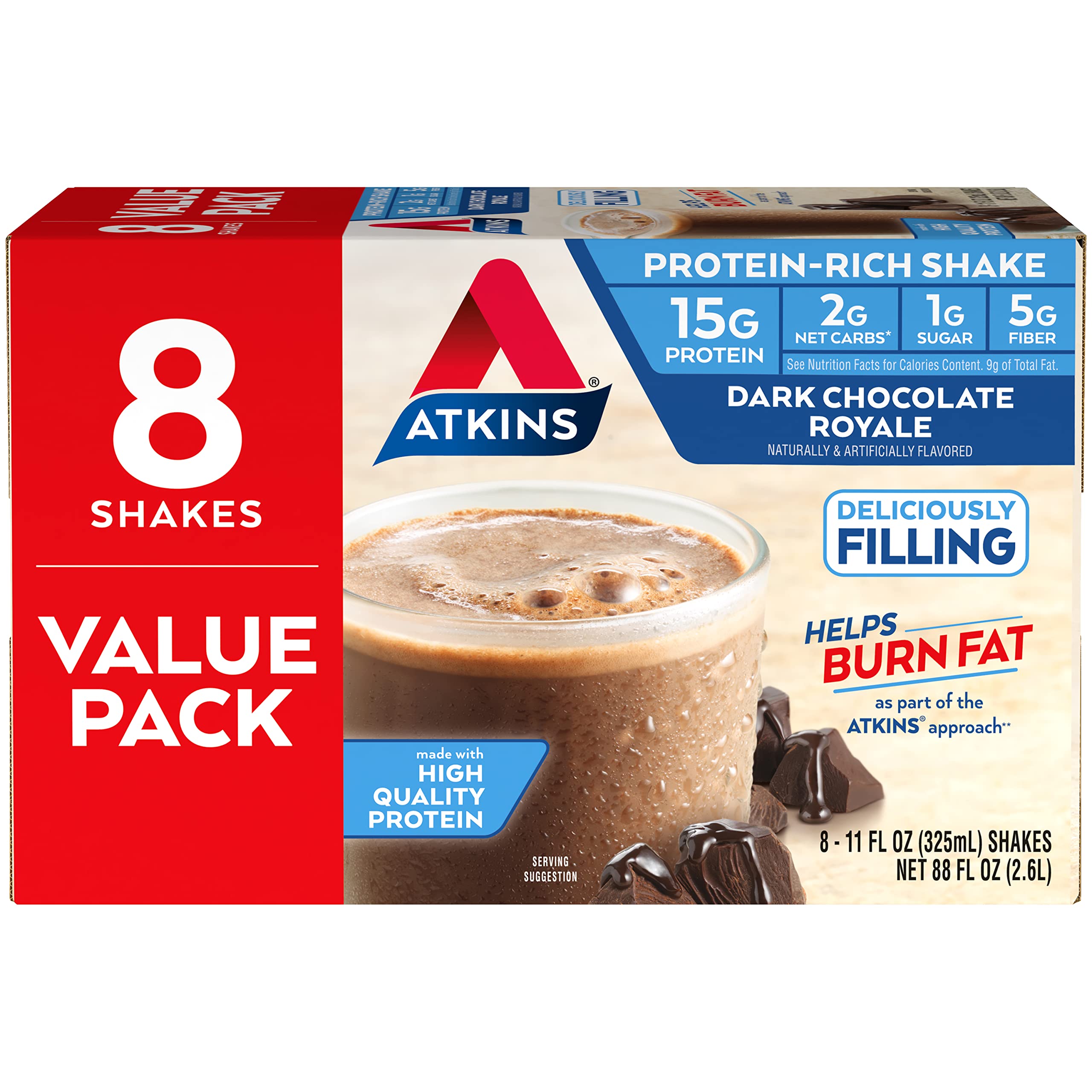 Enjoy the rich, decadent taste of Atkins Dark Chocolate Royale Protein-Rich Shakes and give your body the steady energy it needs. With essential vitamins and minerals, 15 grams of protein and 1 gram of sugar per serving, our shakes keep you satisfied throughout the day. Each shake is gluten free and contains 2 grams of net carbs, making it perfect for a low carb and keto friendly* lifestyle. Includes one box of 8 ready-to-drink dark chocolate protein shakes. The Atkins Diet and Lifestyle provides quick, effective, and balanced weight loss by limiting carbs and sugar to help the body burn fat for fuel and keep your energy steady. With over 80 published clinical studies to support the principles behind the Atkins Diet, we provide filling and delicious snacks to help you stay on track! *When used with Atkins ketogenic programs.