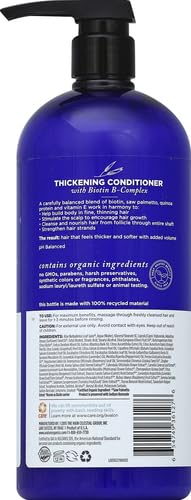 Deeply nourish and hydrate fine, thinning hair with Avalon Organics Biotin B-Complex Thickening Conditioner. Made with organic botanicals and essential oils, this pH balanced formula conditions hair from the follicle through the entire shaft to invigorate the scalp and enhance hair volume. A carefully balanced blend of biotin, saw palmetto, quinoa protein and vitamin E work in harmony to strengthen hair strands and help build body, leaving hair feeling thicker and softer. This EWG VERIFIED, certified organic conditioner is made with non-GMO ingredients and no parabens, harsh preservatives, synthetic colors or fragrances, phthalates or sulfates. It is also vegan and not tested on animals. Includes one 32 oz. bottle of Avalon Organics Biotin B-Complex Thickening Conditioner. Curated from nature?s pure resources, Avalon Organics NSF organic certified skin care, hair care and bath & body products are deep-rooted in a profound respect for the earth. Combining modern science with the botanical world, we constantly strive to perfect each formula, evolve expertise and deliver innovation. Searching out the beautifying benefits hidden within each plant, Avalon Organics thoughtfully develops formulas to not only nourish the body, but also nourish the mind and the soul.