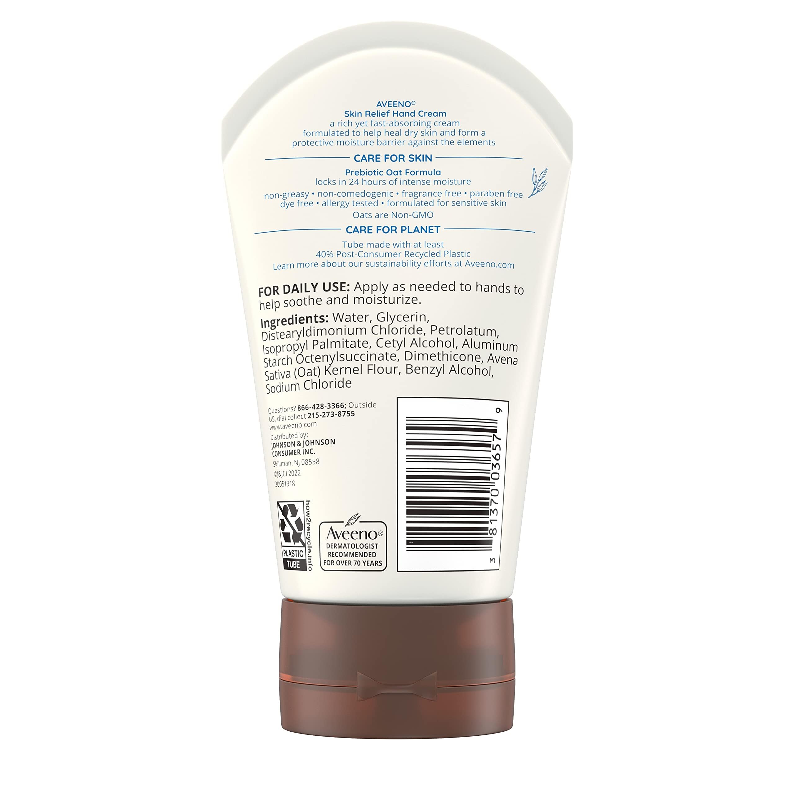 - 3.5-ounce tube of Aveeno Skin Relief Intense Moisture Fragrance-Free Hand Cream with soothing Prebiotic Oat lasts through handwashing and softens and smooths dry hands