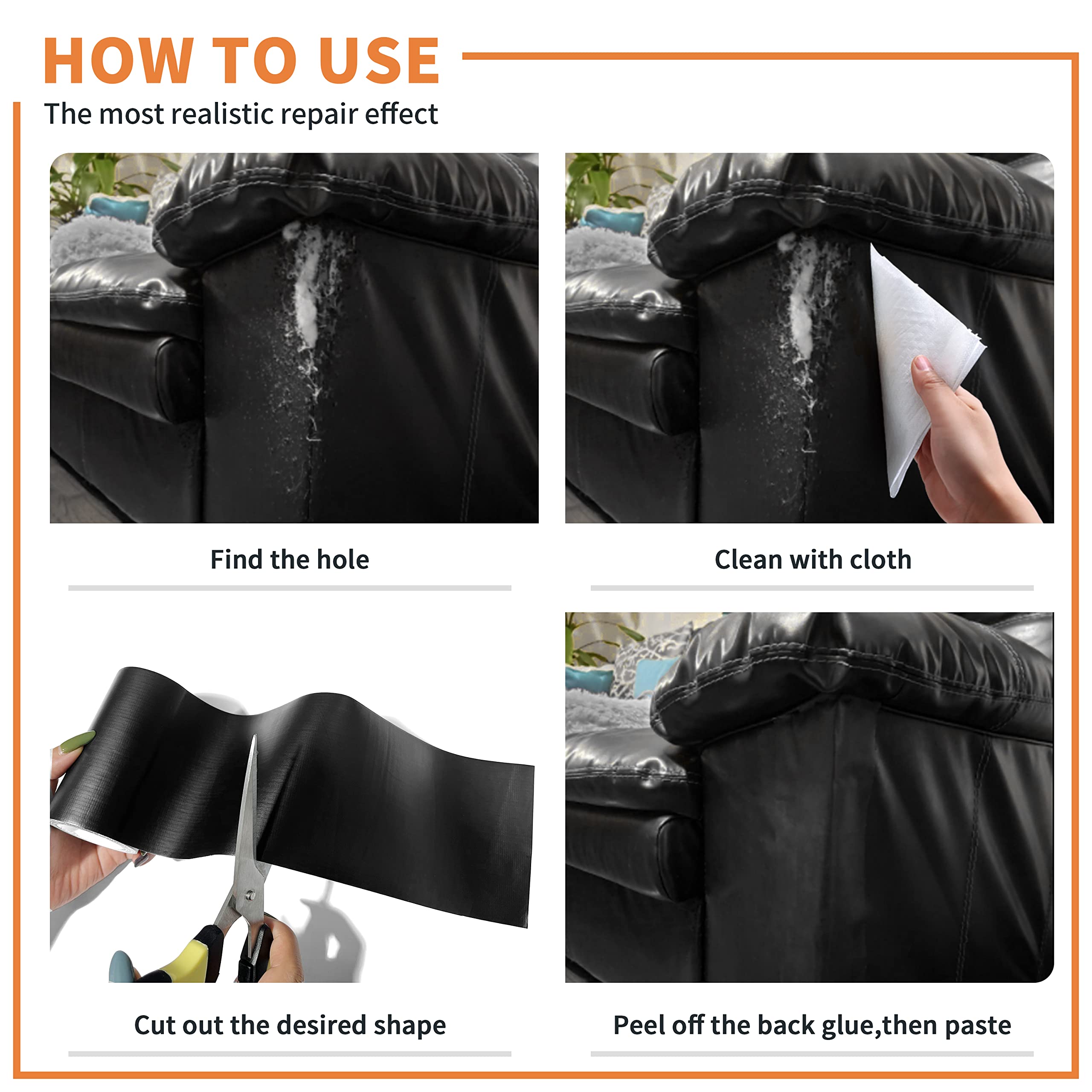• Self-adhesive and easy-to-use leather repair tape? All you have to do is clean the damaged area, cut to the right size, tear off the backing paper, and you’re ready to go. Leather repair tape uses high quality glue, which also ensures that our products last longer under normal conditions.