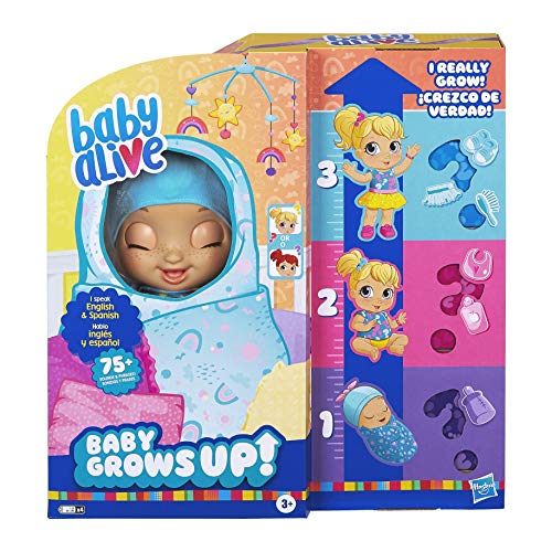 3+ I really grow. I speak English & Spanish. 75+ Sounds & Phrases!. Changes size as she grows. Big girl. Grows taller & hair gets longer. Baby. Sits up says her first word. Newborn. Wiggles & opens her eyes. Includes: Doll with attached onesie, hat, swaddle blanket, bottle, bib, food pouch, brush, shoes, and skirt. Surface clean only. CE listed. FCC Statement: This device complies with part 15 of the FCC Rules. Operation is subject to the following two conditions: (1) This device may not cause harmful interference, and (2) this device must accept any interference received, including interference that may cause undesired operation. 1.5V AA/LR6. X4. www.babyalive.com. how2recycle.info. US/Canada Tel 1-800-255-5516. Made in China.