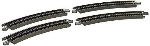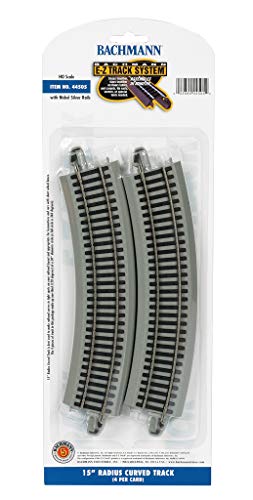Snap-Fit E-Z TRACK 15? RADIUS CURVED TRACK (4/card) – NICKEL SILVER Rail With Gray Roadbed – HO Scale. Bachmann’s exclusive E-Z Track system makes set-up quick, easy and fun. E-Z Track is designed to Snap Together and Stay Together on Floors, Tables and Carpets. This product features Nickel Silver Rail with Gray Roadbed. 15? Radius Curved Track is best used to make railroad curves in tight spots on your railroad layout and appropriate for locomotives and cars with short wheel bases. Four pieces of track make up one-third (120 degrees) of a 30? diameter circle.