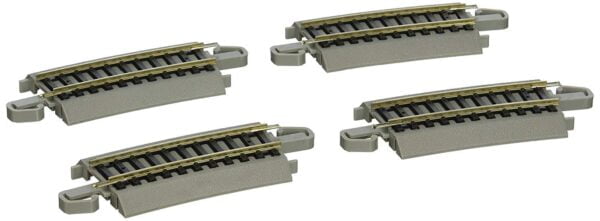Snap-Fit E-Z TRACK ONE-THIRD SECTION 18? RADIUS CURVED (4/card) – NICKEL SILVER Rail With Gray Roadbed – HO Scale. Bachmann’s exclusive E-Z Track system makes set-up quick, easy and fun. E-Z Track is designed to Snap Together and Stay Together on Floors, Tables and Carpets. This product features Nickel Silver Rail with Gray Roadbed. Four pieces of track are the equivalent of one and one-third sections of 18? Radius Curved E-Z Track. They are designed to provide layout flexibility and can also be used as gap fillers in more sophisticated railroad construction.