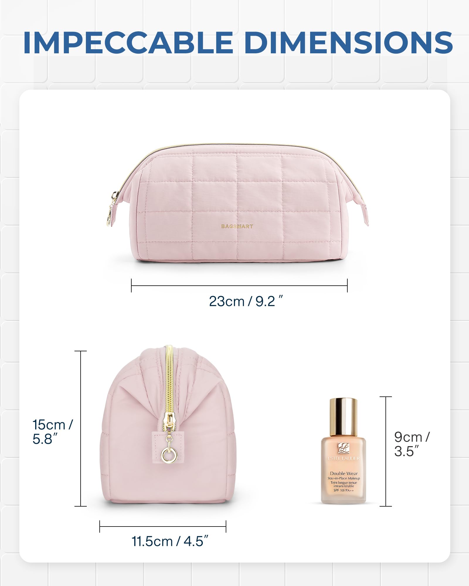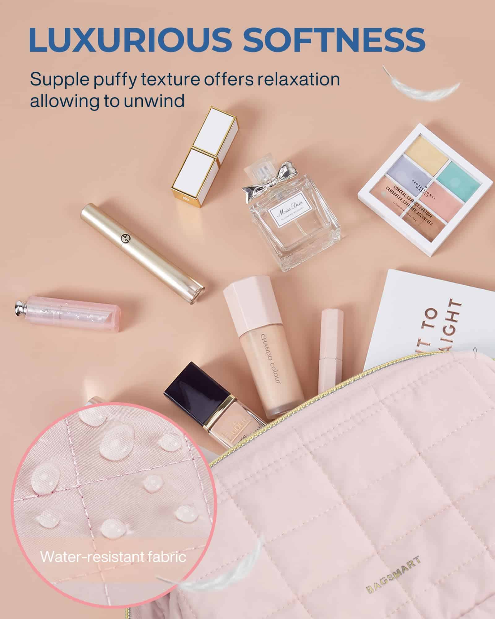 BAGSMART Makeup Bag Cosmetic Bag Wide Open,PinkBAGSMART traveling makeup bag, combines convenience, spaciousness, easy-clean features, high quality, and multi-functionality. Say goodbye to the hassle of searching through small cosmetic bags with our convenient design. – Makeup organizer bag featuring a wide opening. This makeup bag allows effortless access to all your beauty essentials. No more wasting time rummaging for your desired lipstick or eyeshadow; everything is easily within reach. – Not only is our travel make up organizer bag convenient, but it also offers ample space. With dimensions measuring 9×4.5×5.8 inches, this travel cosmetic bag provides plenty of room for your belongings. Inside, you’ll find three practical pockets. Two of these pockets are specifically designed to securely hold smaller items like lipsticks, eyeliners, tweezers, or travel essentials. The third pocket, made from PVC, generously accommodates your makeup brushes, powder puffs, and other travel accessories. – Travel cosmetic bags for women are designed with easy-clean pockets and a PVC lining for your makeup brushes. These dirt-proof pockets ensure that your products remain safe and intact, making it the perfect companion for women who are always on the move. – Crafted from soft and luxurious polyester, our cute and puffy makeup organizer bag not only looks visually stunning but also feels incredibly tactile. Cosmetic pouch has high-quality construction and smooth texture enhance the overall experience, making it a pleasure to handle and use. – But that’s not all! Our travel makeup bags serves multiple functions. Whether you need a travel essential, a daily purse organizer, a makeup pouch, a tech accessories bag, or a travel accessories bag, our multi-functional design has got you covered. Cosmetics organizer bag is also an excellent gift choice for special occasions like Christmas, birthdays, or Valentine’s Day. Its elegant design and practicality make cosmetic travel bags the ulti