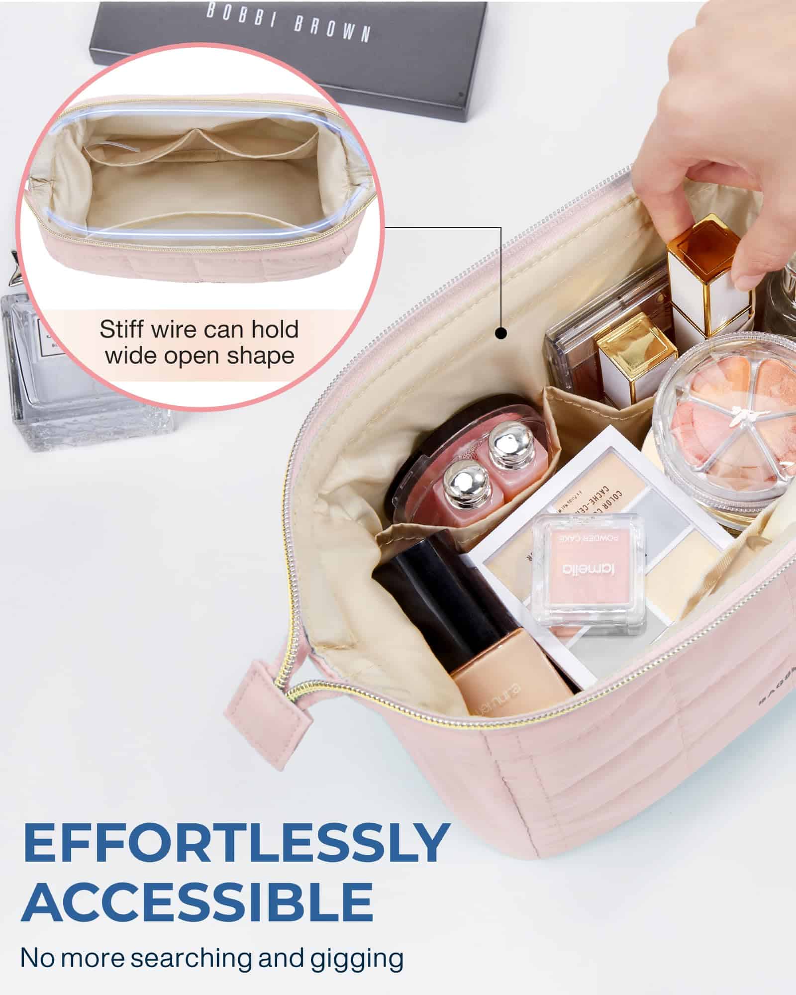 - ?CONVENIENT DESIGN?- The wide opening design of this makeup bag allows for effortless access to all your beauty essentials. Say goodbye to wasting time searching through tiny cosmetic bags. With this women’s makeup bag, you can quickly find your desired cosmetics like lipstick or eyeshadow.