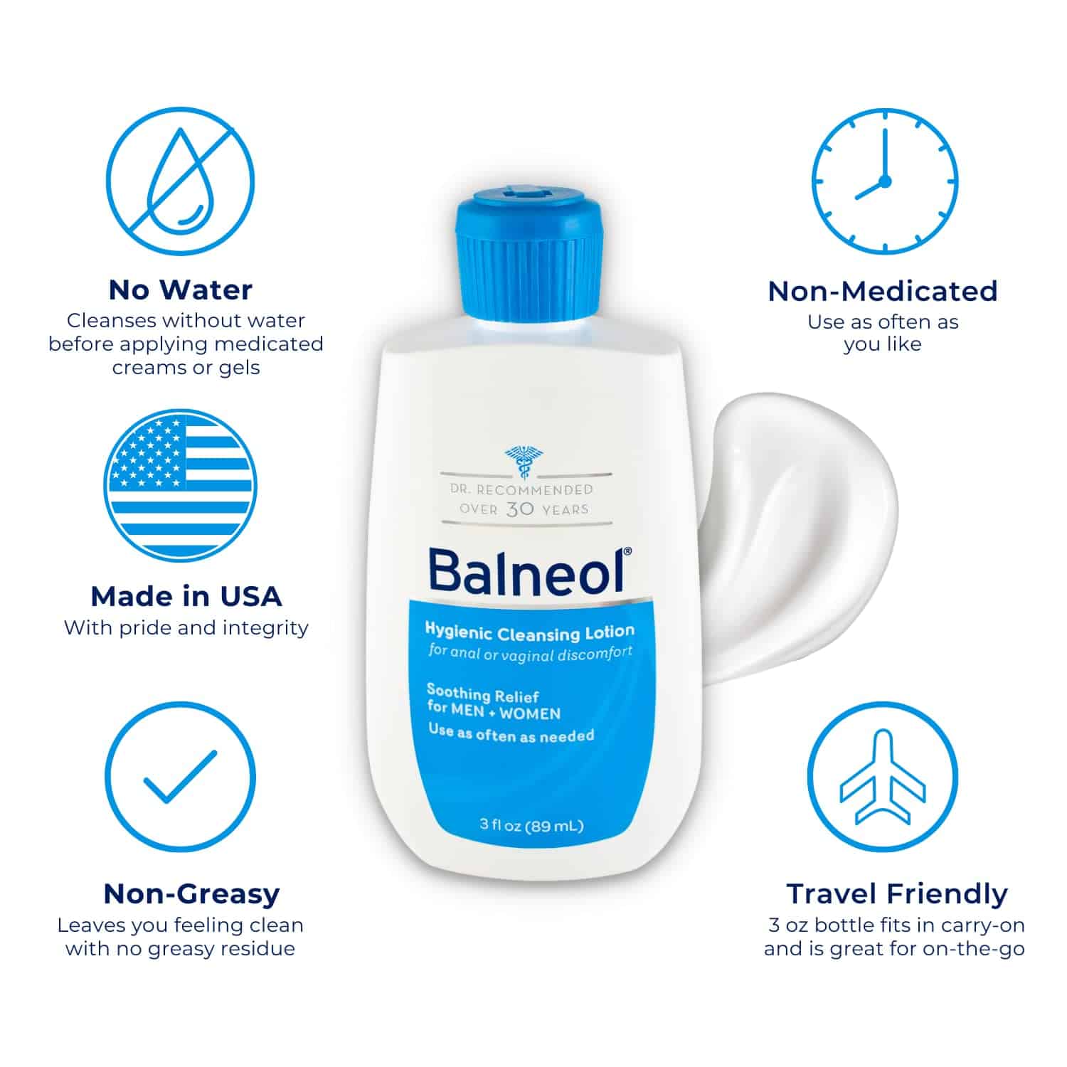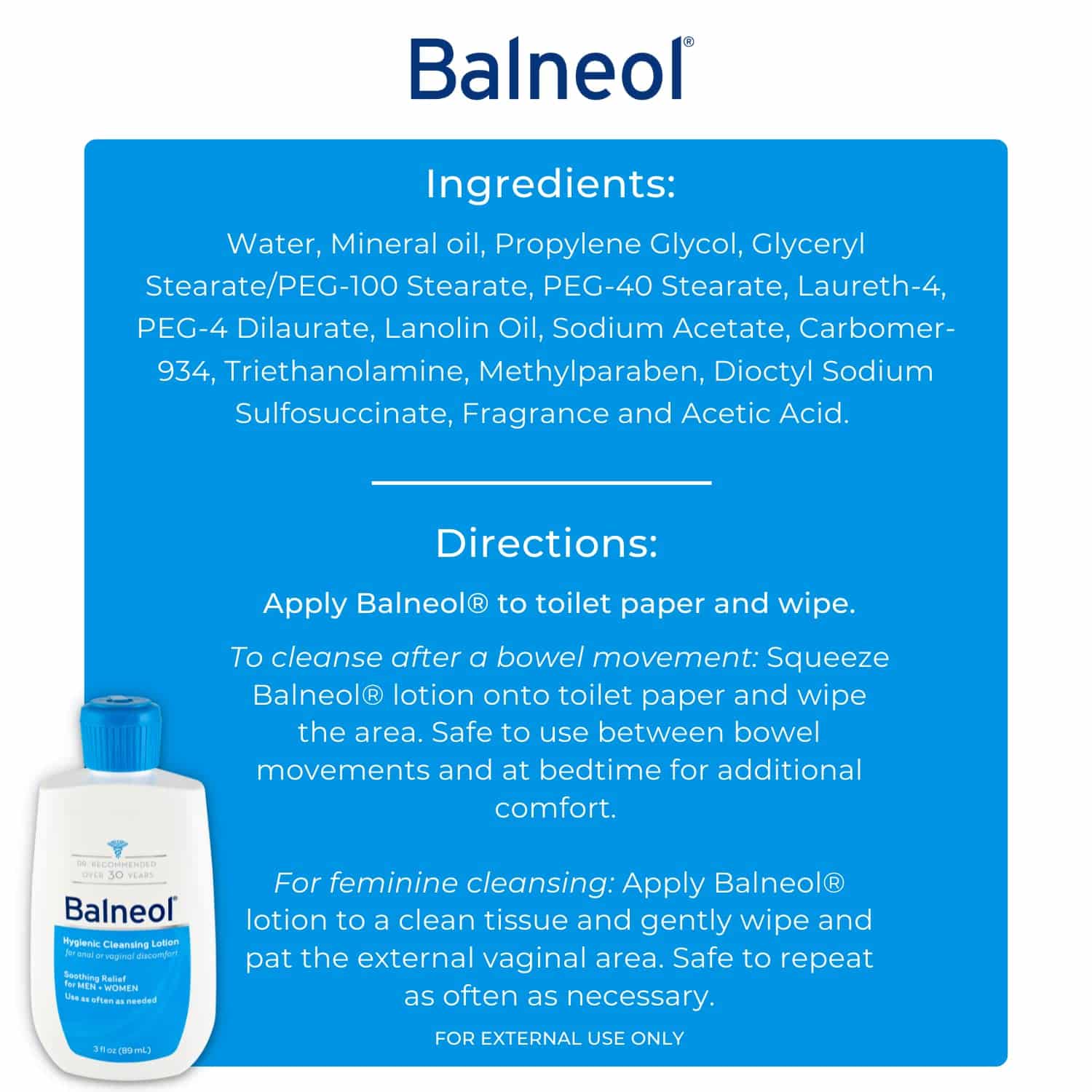 The perfect remedy for a private matter, BALNEOL?s silky lotion allows for gentle cleansing without the dry tug of plain toilet paper. This hygienic cleanser gently soothes, cleanses, and moisturizes your sensitive spots. Safe for use during pregnancy, post-partum, and bouts of diarrhea, BALNEOL has been doctor recommended for over 30 years to men and women who are suffering from anal, vaginal, and perianal irritation, discomfort, and itching. Made with lanolin, propylene glycol, water, and mineral oil, BALNEOL is non-medicated and can be used in conjunction with hemorrhoid treatments. Use BALNEOL as often as needed on toilet paper to clean fecal residue or discharge without water. It does not sting or thin the skin and leaves it moisturized without a greasy residue. The travel-friendly 3oz bottle is easy to slip into your carry-on for convenient relief on-the-go. Made in USA.