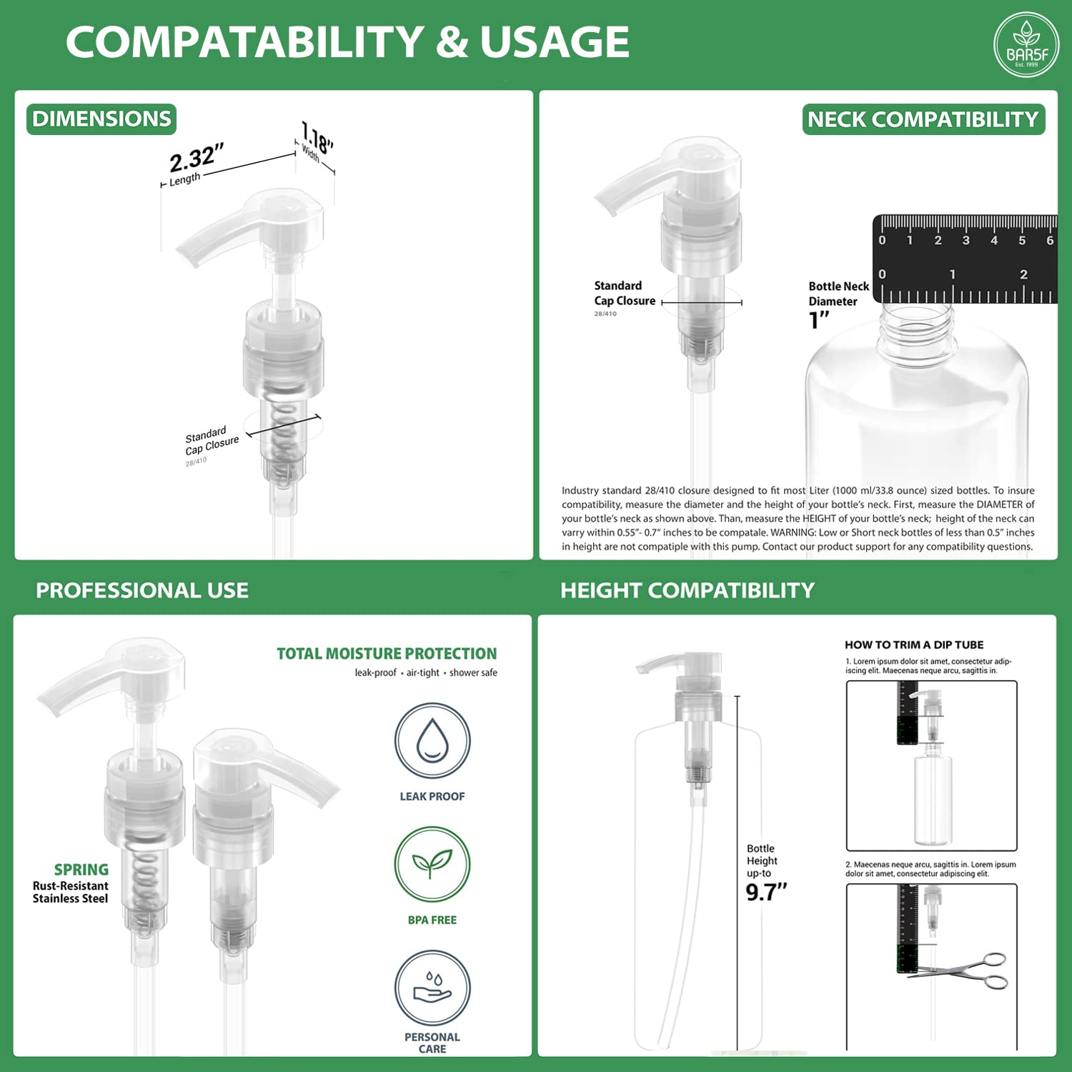 Portion Your Shampoo or Conditioner with a Pump Cap. This Will Eliminate Waste and Make Your Product Last Longer. Works On Standard Size Liter Bottles. Measure your bottle’s neck to insure comparability. Will fit bottles with a neck size of 1″ Inch (28/410). The height can be trimmed, please see instructions.