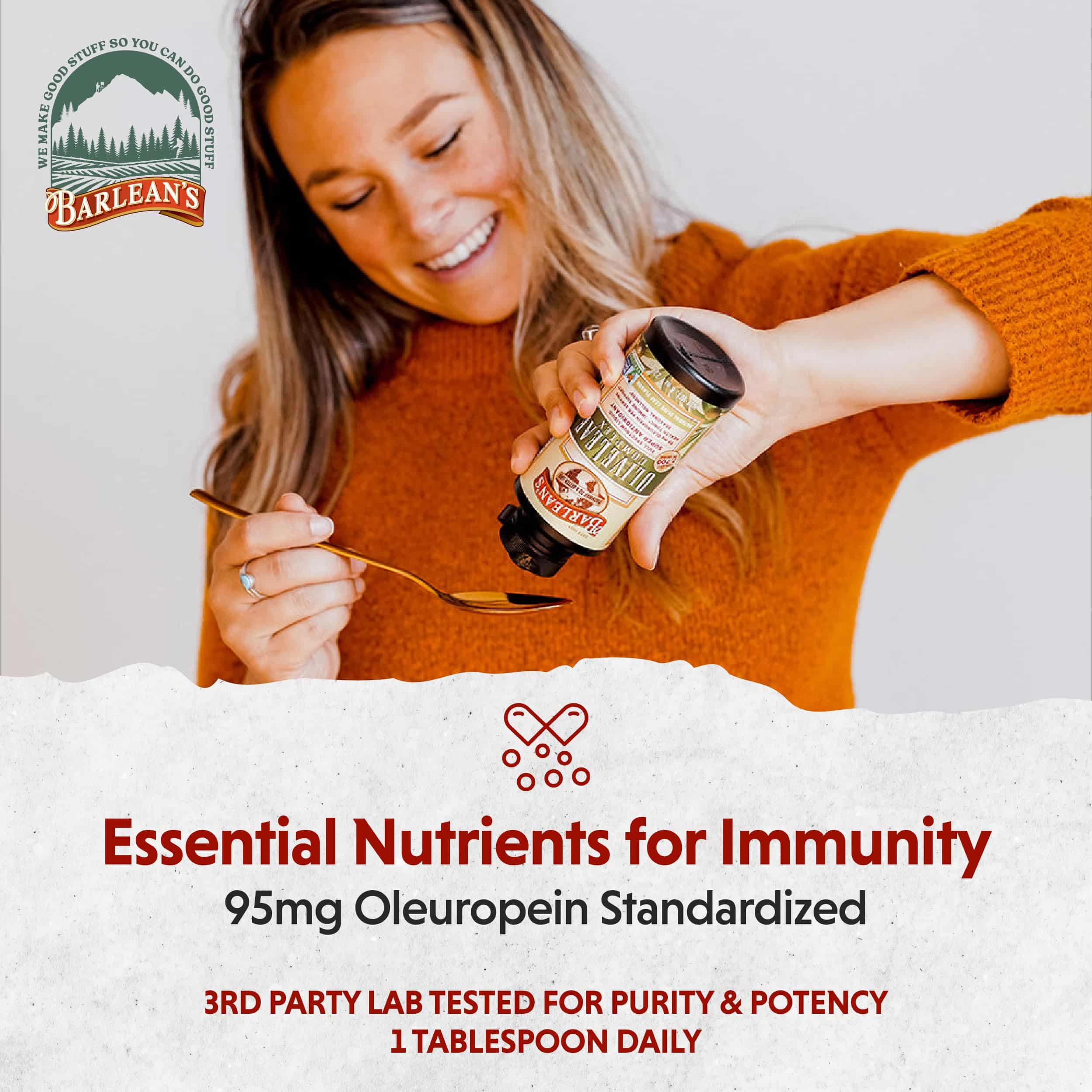 - PREMIUM INGREDIENTS & ROBUST FLAVOR: Barlean’s olive leaves are freshly picked from the Andalusian regions of Spain and fresh-pressed, capturing full nutritional potency. Every serving offers a total of 95 mg oleuropein per liquid tablespoon. Be prepared to taste the potency