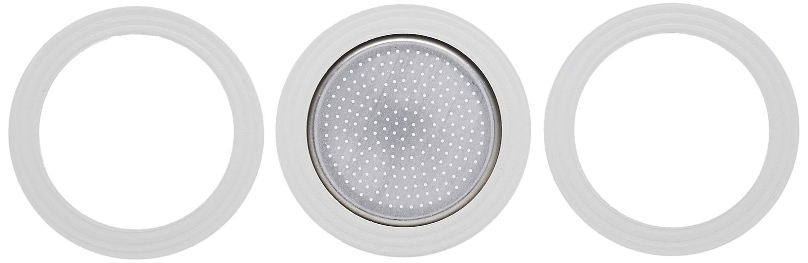 Continue enjoying your favorite Bialetti stove-top espresso maker with this set of replacement gaskets and filter. This set includes three white rubber replacement gaskets and one filter plate. Designed for use in the Bialetti 1 cup moka express stove-top espresso coffee maker. It is compatible with 1 Cup Moka Express, Break, Dama, Mini Express, and Fiammetta