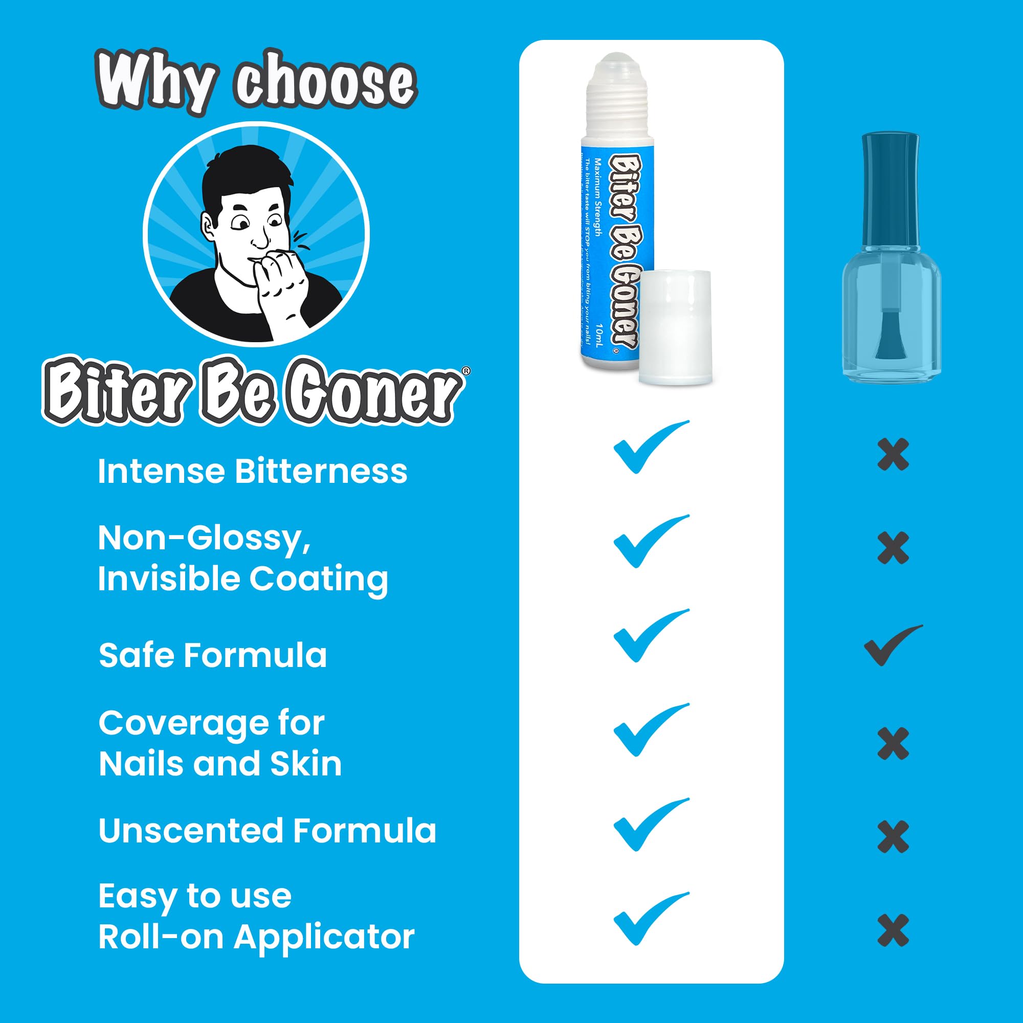 - Stop Thumb Sucking and Nail Biting Today – Put an end to thumb sucking and nail biting. Achieve healthier, neater nails with the Biter Be Goner nail biting treatment for kids and adults. By leaving a bitter taste in your mouth, it effectively curbs these unhealthy habits.