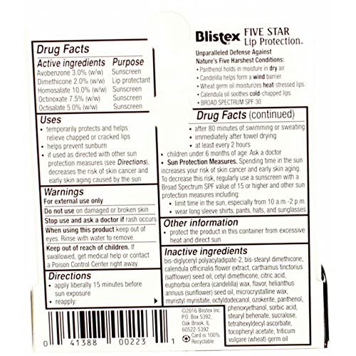Blistex Five Star Lip Protection is a one-stop defense against nature’s harshest elements. With its unique system of five specialized ingredients, it delivers unparalleled protection against dryness, sun, heat, cold, and wind. Whether you’re braving the dry winter air or enjoying a day at the beach, this will keep lips soft, hydrated, and protected. NDC Code(s): 10157-1171-1