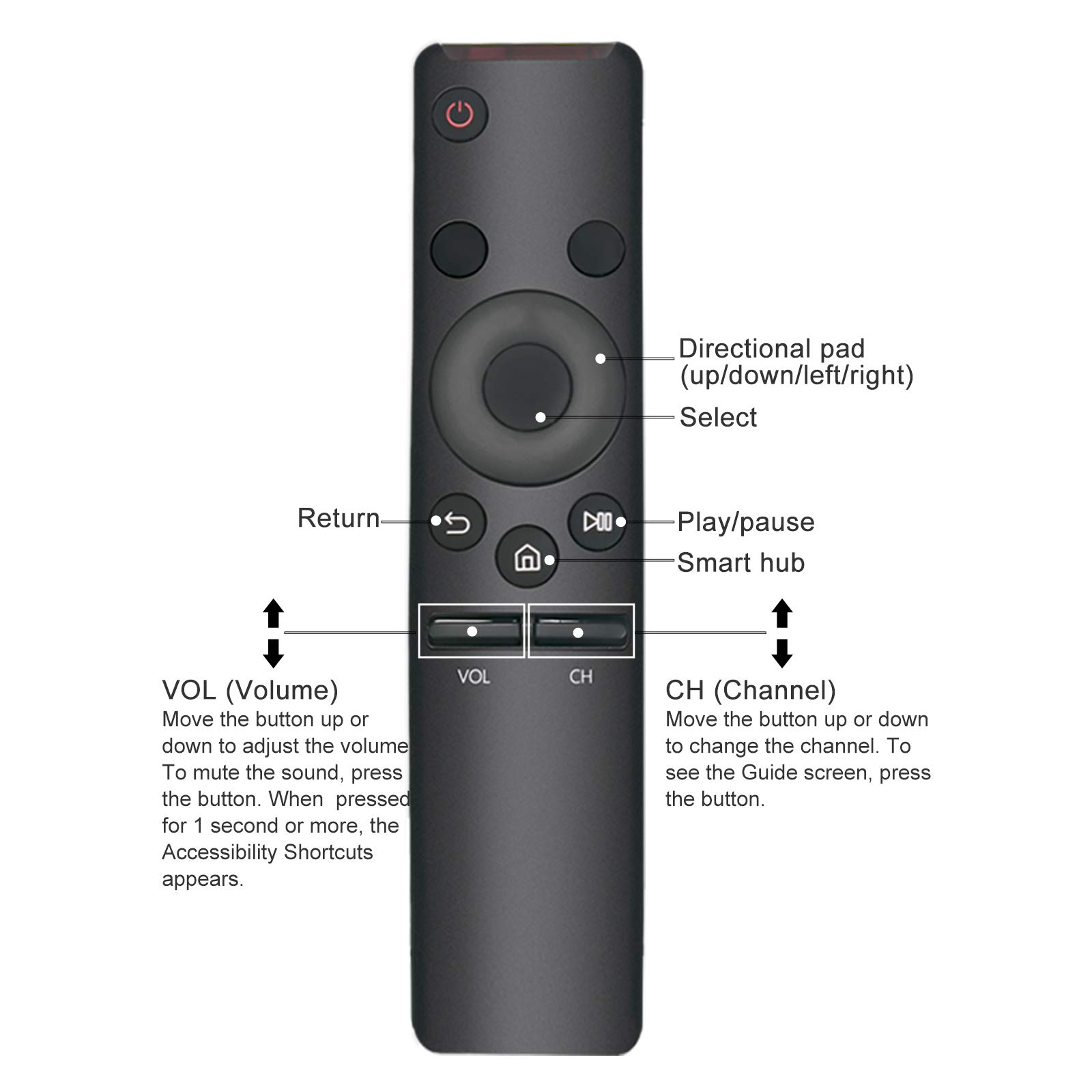- Please NOTE: 1. VOL (Volume): Move the button up or down to adjust the volume. To mute the sound, press the button. When pressed for 1 second or more, the Accessibility Shortcuts appears; 2. CH (Channel): Move the button up or down to change the channel. To see the Guide screen, press the button.