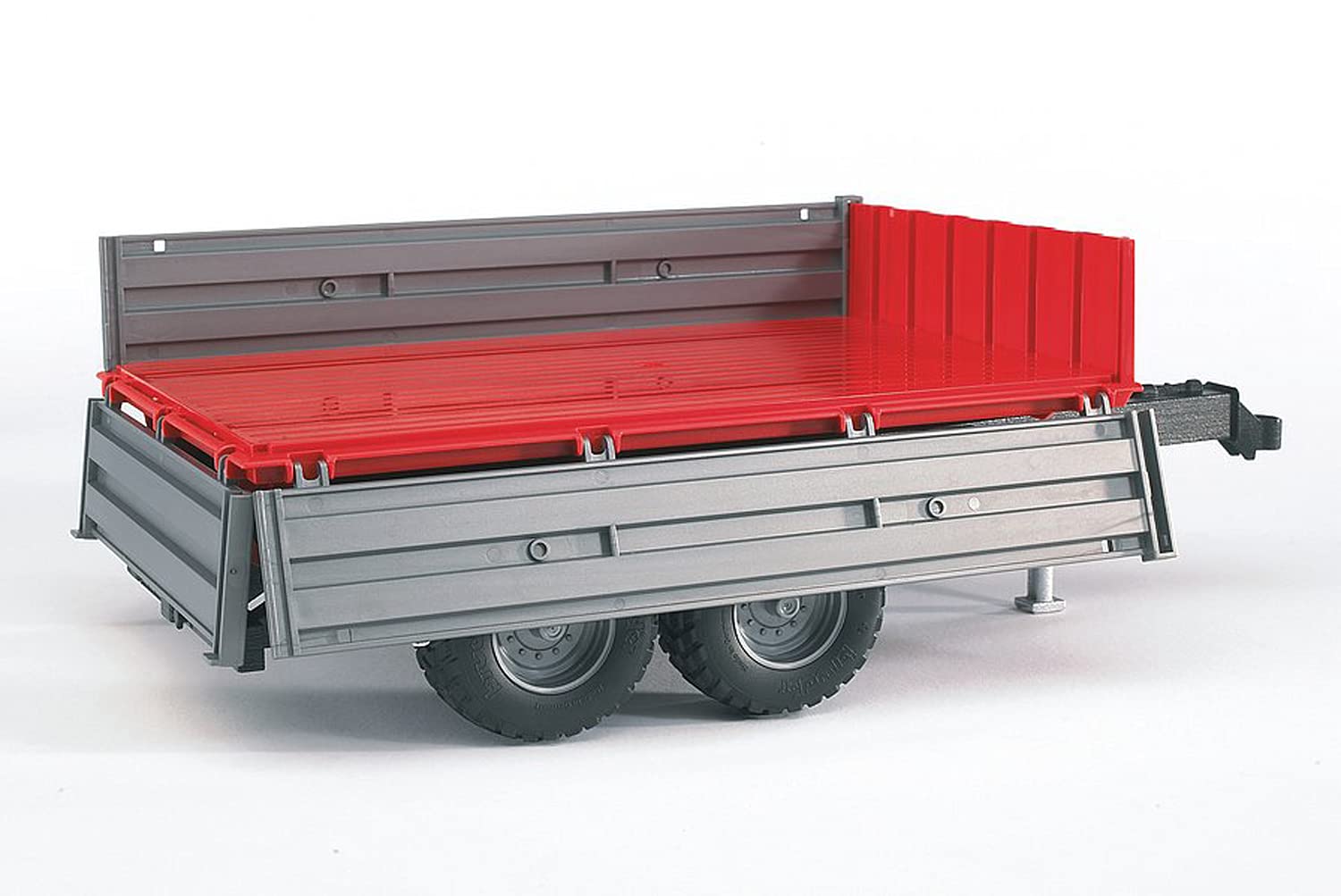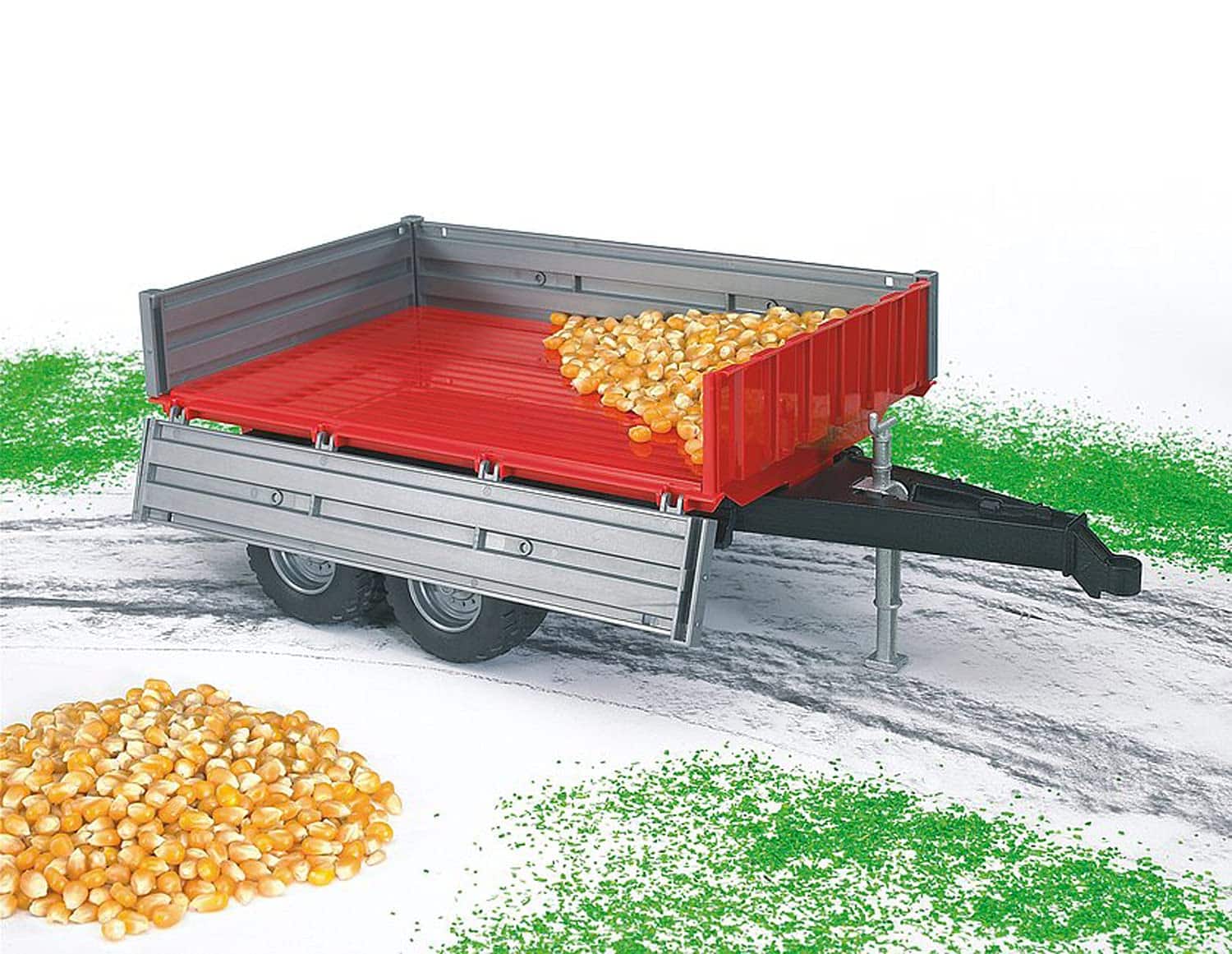 This red and grey double-axle tipping trailer is a great accessory to all tractors. The tailgate and side walls can be kept up or lowered to create a flatbed trailer. Stabilizer leg extends down when it is not being towed; From the Manufacturer; Small, easy-to-maneuver trailers are used for minor transporting tasks in the construction, farming, and forest industry. These trailers are usually pulled by different vehicles such as small tractors and MB Unimogs. This is why our Tipping trailer is the perfect match to our Bruder tractors, the MB Unimog, and the Mercedes Benz Sprinter. The 3 fold-down boards, the tiltable stake body, as well as the fold-out sustainer give the player much to do and make this to