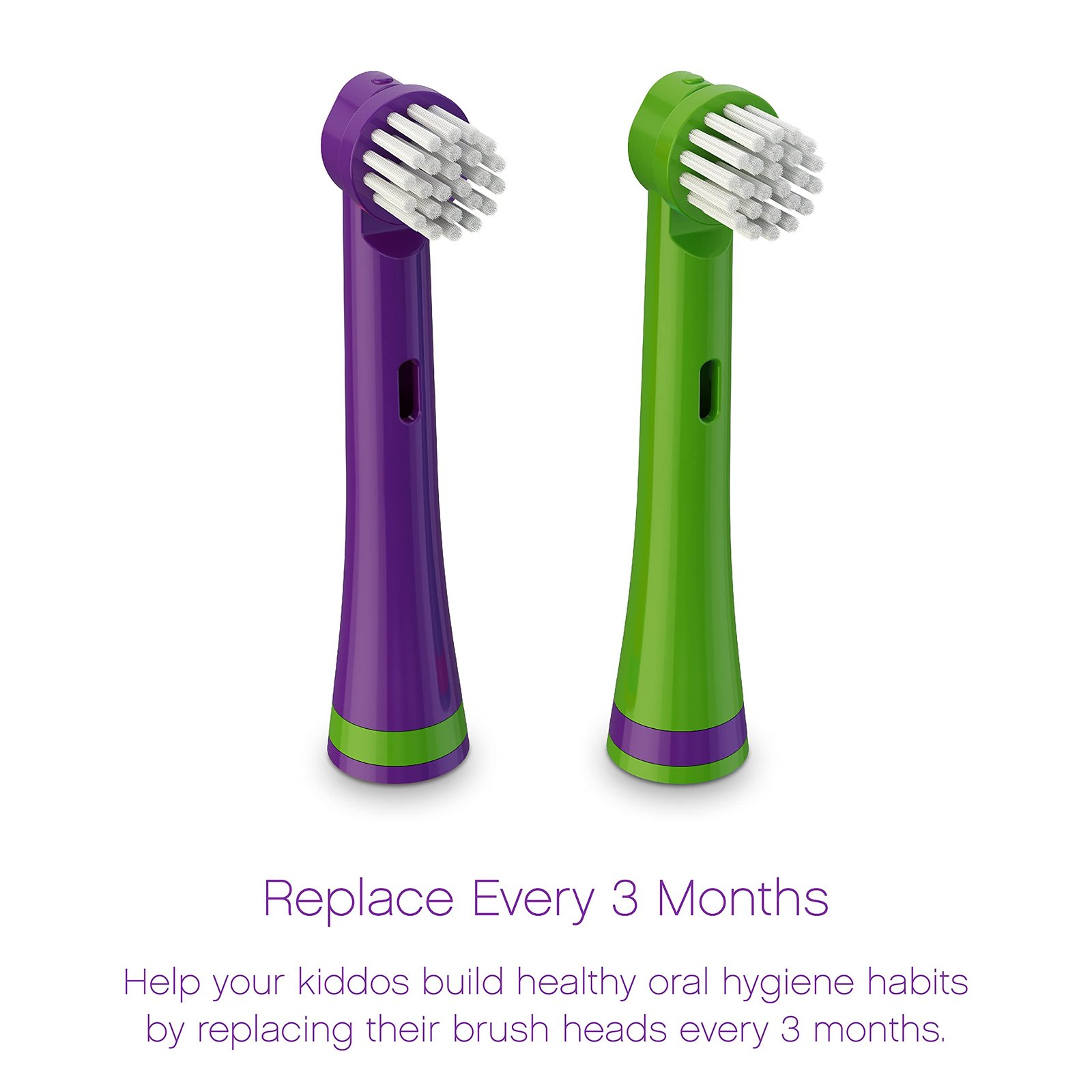 Keep your child’s Brusheez electronic toothbrush working optimally with these replacement brush heads designed in colors that coordinate with your existing toothbrush set.Our replacements come in a convenient 2-pack and coordinate perfectly with your child?s Brusheez toothbrush. Product Details: Quick twist-and-click installation Compact design is perfect for reaching hard-to-clean areas of the mouth Quality tested and CPSIA approved for safe, effective cleaning Durable bristles last up to 3 months before each individual brush head needs to be replaced Compatible with Brusheez Electronic Toothbrush Set for Snappy the Croc Dentists recommend that you install a new brush head at least every 3 months or sooner if any of the following situations occur: Your child has been sick Your brush head is tattered and worn Your child has used the toothbrush to clean something other than his or her teeth