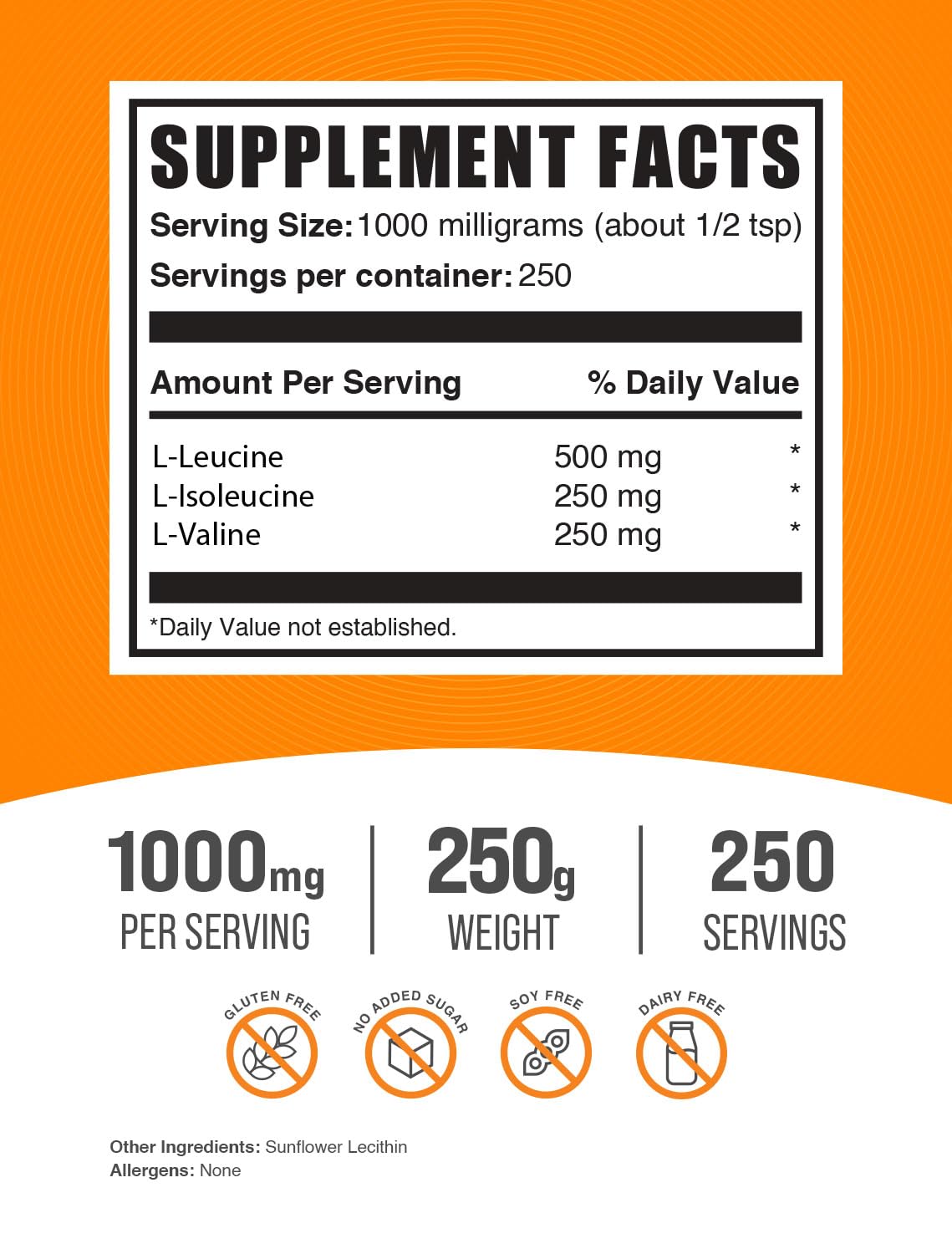 Branched Chain Amino Acids, or BCAA powder by BulkSupplements.com is one of the selections of amino acids supplement. This BCAA has a ratio of 2:1:1 of L-Leucine, L-Isoleucine and L-Valine. Each serving of this product contains 6000mg (6g), with 3g of Leucine, 1.5g of Isoleucine, and 1.5g of Valine, which is about 3/4 tbsp. Contents of this product is sold by weight, not volume and settling may occur. And, we also sell it different sizes ranging from 100g to 5kg in resealable bags Our BCAA 2:1:1 powder, or BCAA powder, is pure, clean, and contains sunflower lecithin as filler. And this BCAA supplement is dairy free, gluten free, soy free, yeast free, no added sugar. All products by BulkSupplements.com are manufactured according to cGMP Standards to ensure the highest quality for manufacturing, packaging, labeling, and holding operations. We work with a third-party laboratory that test our products at multiple stages during production, from raw material to finished products, and ensures compliance, standards, and consistency.