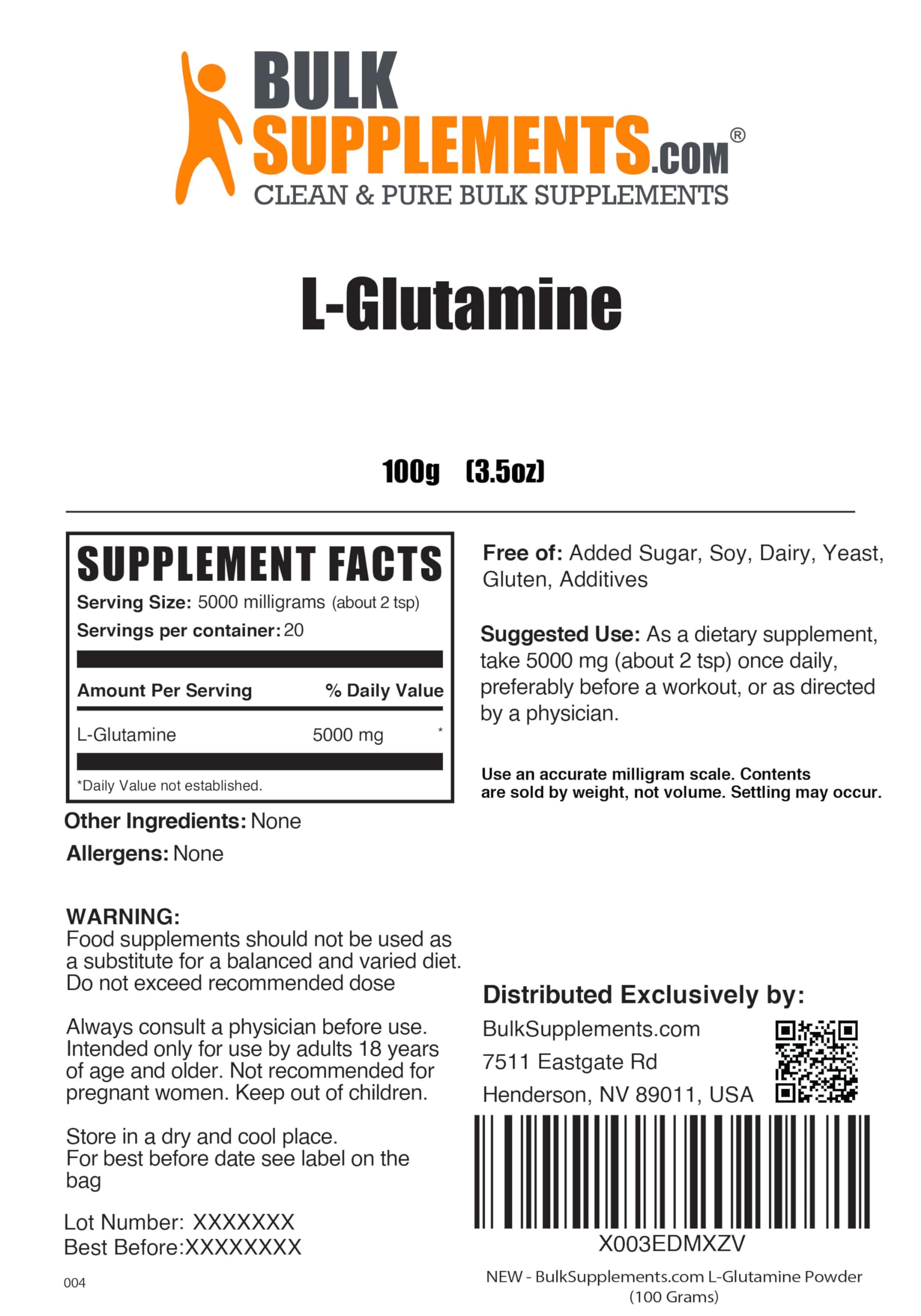 L-Glutamine powder by BulkSupplements.com is one of the selections of amino acids supplement. L-Glutamine is an amino acid that is naturally produced by the body and sometimes considered as an essential amino acid.* Each serving of this product contains 1000mg or 1g of L-Glutamine which is about 1/3 tsp, and may need a gram scale to measure. Contents of this product is sold by weight, not volume and settling may occur. And, we also sell it different sizes ranging from 100g to 5kg in resealable bags. Our L-Glutamine powder is pure, clean, and does not contain any fillers, additives and artificial flavors. And this glutamine supplement is dairy free, gluten free, soy free, yeast free, no added sugar. All products by BulkSupplements.com are manufactured according to cGMP Standards to ensure the highest quality for manufacturing, packaging, labeling, and holding operations. We work with a third-party laboratory that test our products at multiple stages during production, from raw material to finished products, and ensures compliance, standards, and consistency.