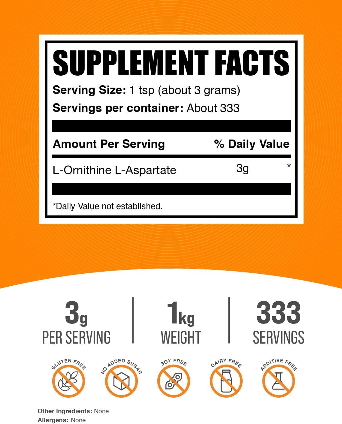 - Maximize your Potential: Enhance your active lifestyle with our L-Ornithine L-Aspartate powder, designed to support your strength and performance goals. Each serving delivers a substantial 3g dose, catering to both fitness enthusiasts looking to push their limits.