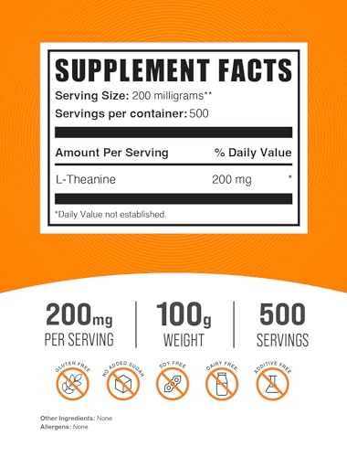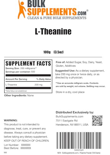 BulkSupplements.com L-Theanine Powder – L-Theanine Supplement, L-Theanine 200mg – Amino Amino Supplement, Pure & Gluten Free, 200mg per Serving, 100g (3.5 oz) (Pack of 1)