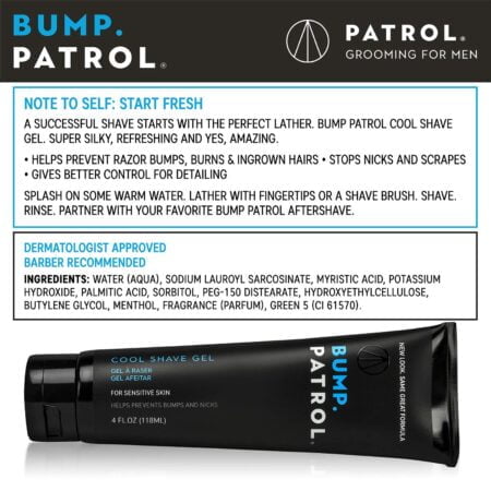 Ingredients: Water, Sodium Lauroyl Sarcosinate, Myristic Acid, Potassium Hydroxide, Palmitic Acid, Sorbitol, PEG-150 Distearate, Hydroxyethylcellulose, Butylene Glycol, Menthol, Fragrance, Green 5 (CL 61570). Directions: Instructions: Wet your face & apply a small amount Of bump patrol cool shave gel toyour fingertips or a shave brush. Lather face well. Add water for morelather. Shave & apply bump patrol aftershave razor bump treatment.