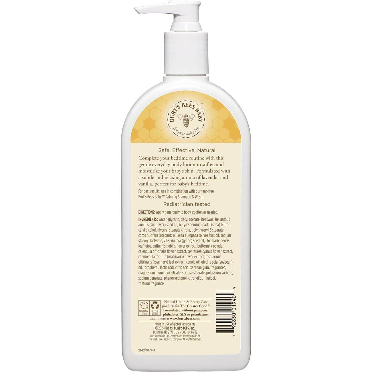 - CALMING COMFORT LOTION: Burt’s Bees Baby Calming Nourishing Body Lotion has a relaxing aroma of lavender and vanilla that helps calm and lull baby to sleep