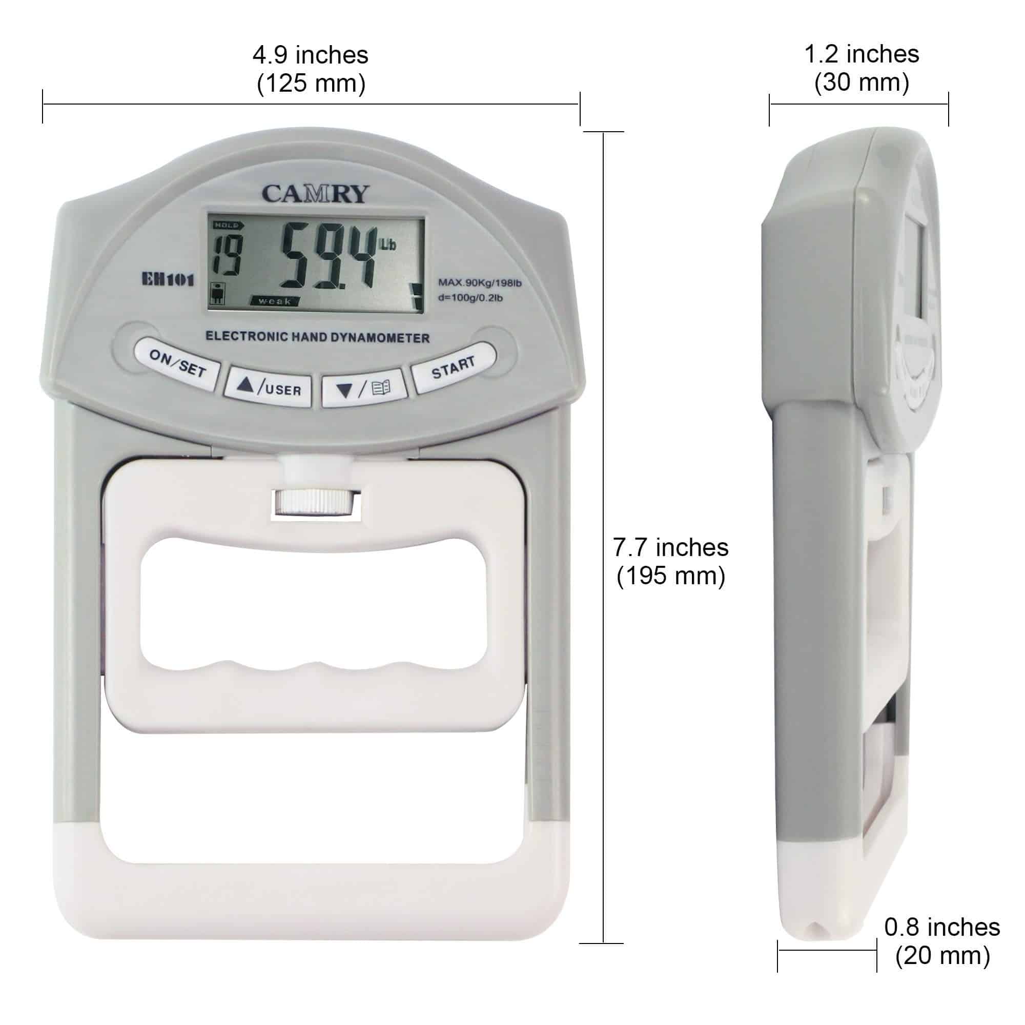 OverviewThe Camry digital hand dynamometer is engineered as a professional testing device for handgrip strengths suitable for any doctor’s office, physical therapy clinic, engineering lab, or the gym.-Adjustable center knob allows the device to be adjusted for different hand sizes and preferences.-19 definable users with options for gender and age to store, along with the ability to save and recall test results for each user.Compares individual test run for each of the 19 users, and displays the incremental increase, or decrease from the last record.Each test run is rated “weak”, “normal”, or “strong” based on age and gender data entered for each user.-Easy switch from lbs. to kg. at any time, including for last recorded data.How to Use1. Remove the isolation tag from the battery case;2. Press (ON/SET) button to turns on;3. The middle two buttons (ARROWS up/down) allow you to select a different user. Then press (ON/SET) button to cycle between gender and age of the selected user, and edit the values using the arrows.4. When you are ready you can hit the (START) button to test your hand grip.5. Now if you press (ON/SET) button, it converts between LB / KG.6. While squeezing, it shows the amount of force you are currently squeezing, as soon as you let go it shows you the max/peak of what you squeezed.7. Press the (ARROW down) button if you want to save the result, or hit (START) button to retest.8. After you test your grip, and the max result is displayed, if you wait 6 seconds it will then tell you how many lbs/kgs more/less you’ve done in comparison to your saved result.WarrantyEvery hand dynamometer is individually hand tested for defects and accuracy before it leaves the factory.We offer 5-year product warranty.