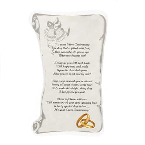 Poem reads “Have a happy silver anniversary! A day that is filled with fun; and remember 25 years ago when two became one! Today as you both look back with happiness and pride upon the cherished years that you’ve spent side by side! May every moment you’ve shared seeing all your dreams come true, help make this bright, shiny day a happy one for you! These soft tunes whisper with reminders of your ever-growing love. A truly special day indeed; It’s your silver anniversary!