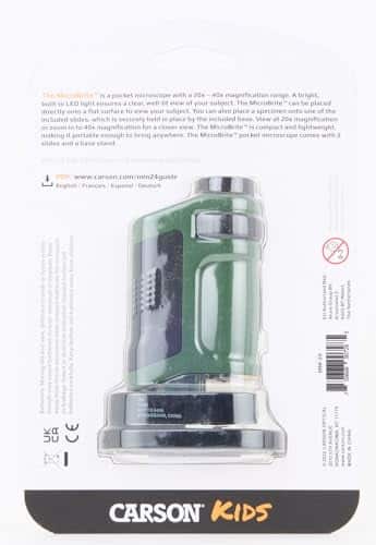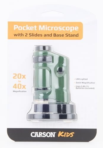 The MicroBrite (MM-24) from Carson is a zoom pocket microscope that is a great learning and educational tool for children and adults of all ages. The MicroBrite contains a 20x-40x power zoom magnification to examine intricate details on almost anything that nature and wildlife has to offer. The MicroBrite is LED lighted and is extremely compact and lightweight. Each MicroBrite pocket microscope is included with a removable base and 2 specimen slides. Each MicroBrite field microscope is powered by 3 LR-44 button cell batteries (included). The MicroBrite is a perfect beginner portable microscope for people of all ages. The MicroBrite is a wonderful gift to introduce kids to the joys of science. The MicroBrite is backed by Carson. At Carson, we strive to make sure our customers are 100% satisfied with the quality of our products..