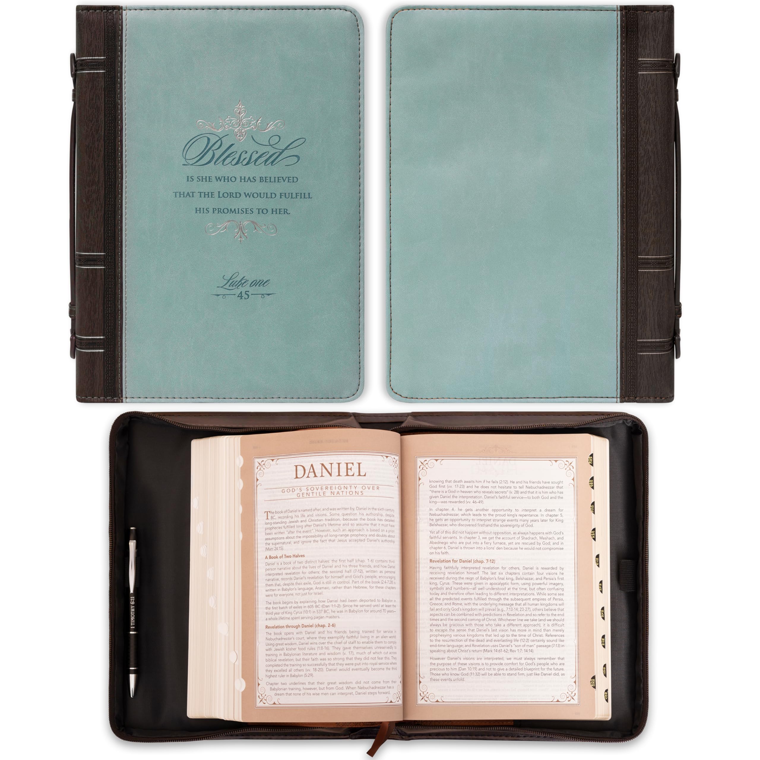 • Convenient Accessories: Handle is easy to hold, or slip this Bible cover into a larger bag for easy travel to church or Bible Study. Interior pen loop secures your pen or highlighter when not in use.