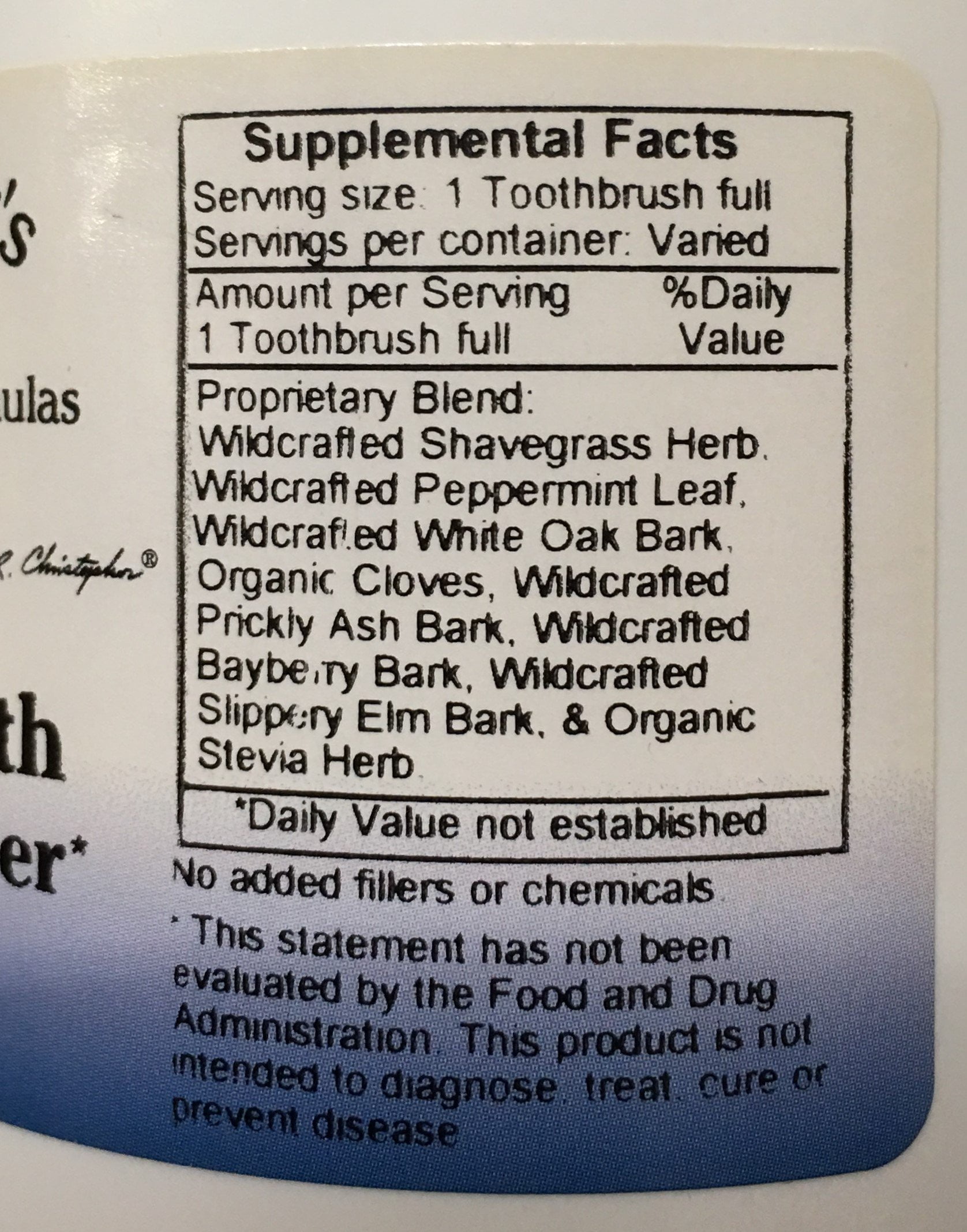 A synergistic blend of whole herbs for teeth brushing. With all the biting, gnashing and chewing our teeth do it’s amazing how resilient they are. Still, the natural aging process takes a toll as adults often have weak tooth enamel, chipping, cavities, sensitivity, soreness and gum pain. Dr. Christopher’s Herbal Tooth and Gum Powder aids in strengthening gums and brightens the teeth luster.