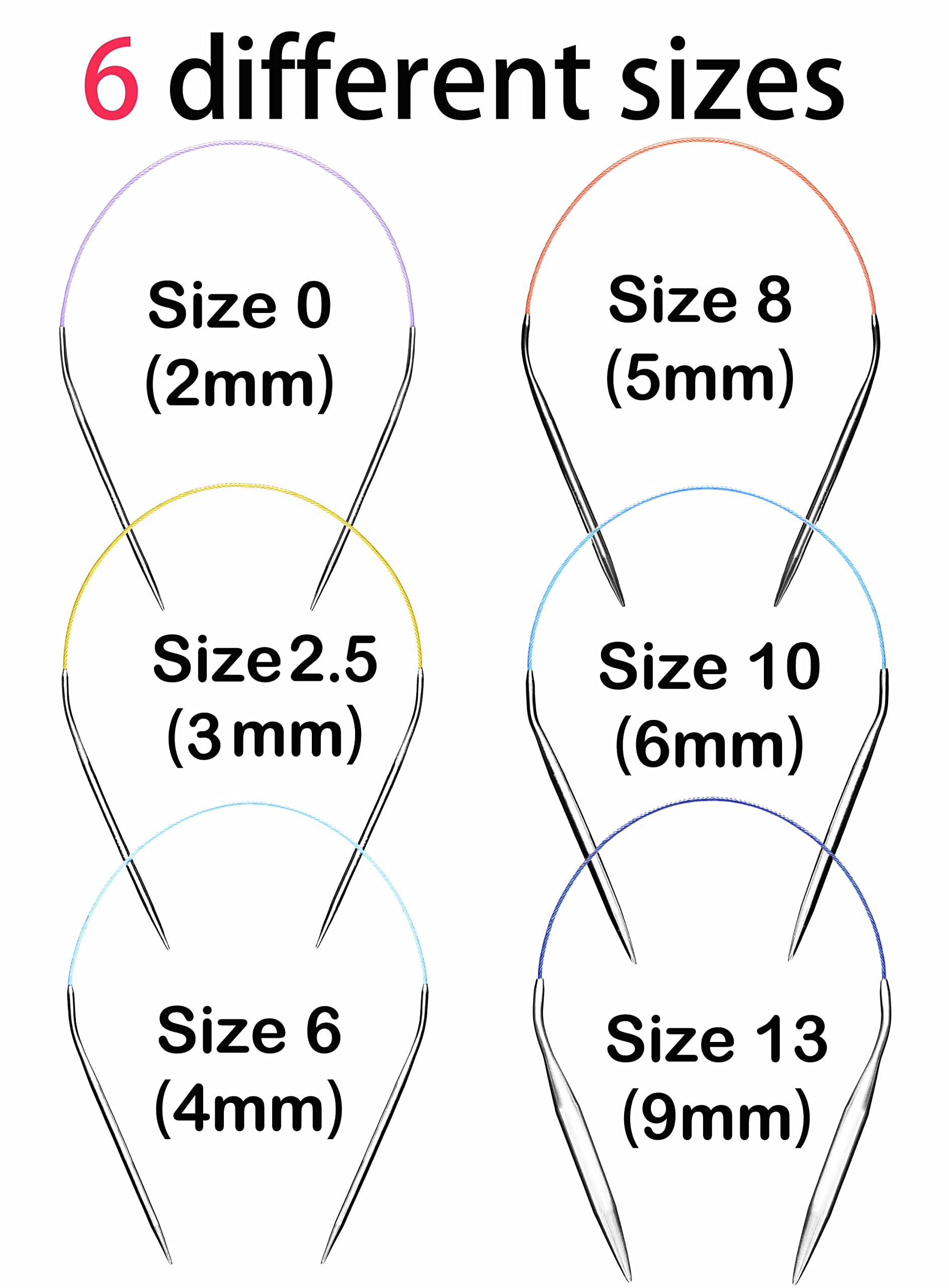 - The kit includes 6 needles – Size 13 10 8 6 2.5 0. Each needle tip is 4.5″ long. The tube is 7″ long. Total length is 16″ long, nice for small knit projects, like beanies, sleeves.