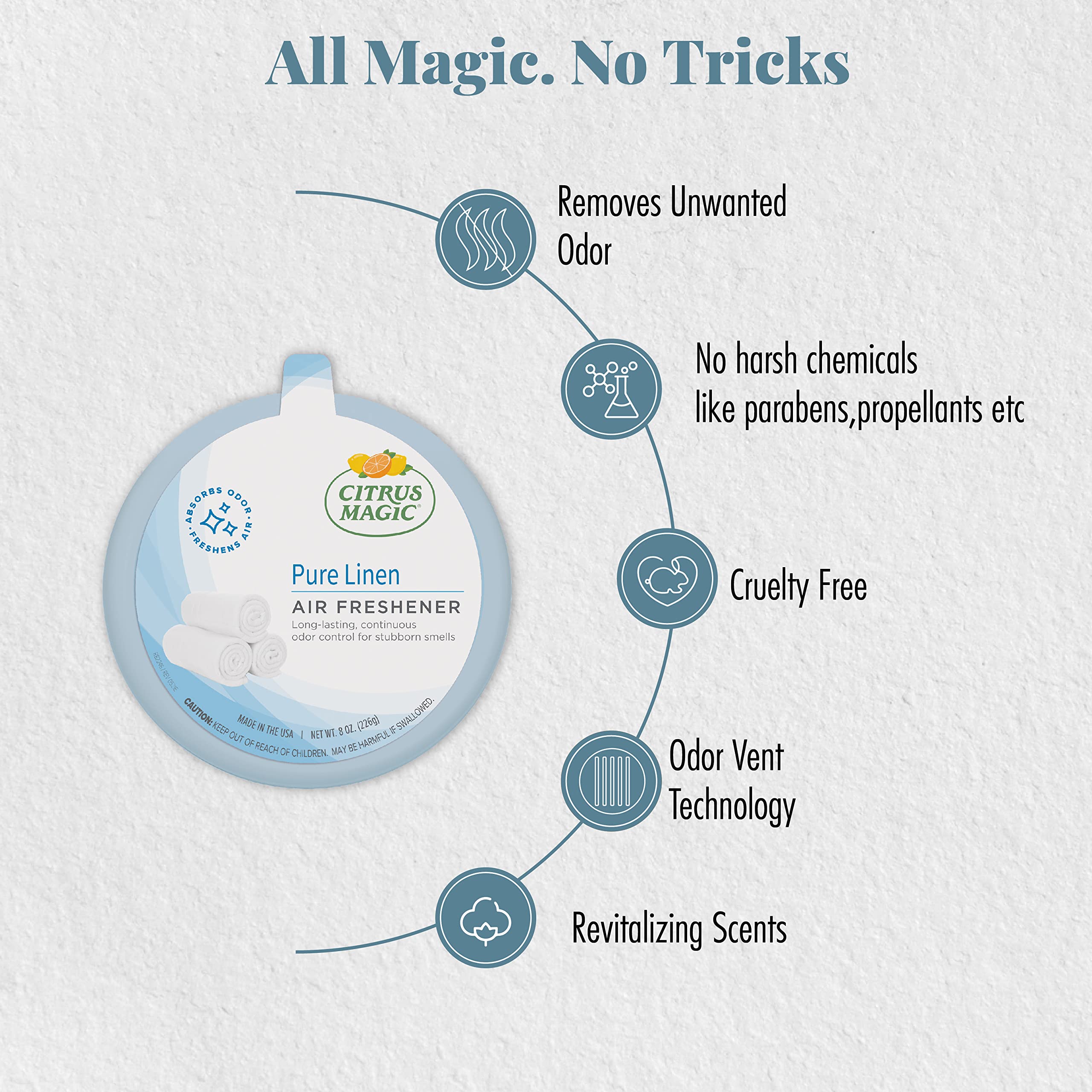 Citrus Magic Solid Air Fresheners provide convenient and long-lasting odor control. Created with a unique formula, the solid air fresheners absorb odors and leave a clean, fresh scent in the air. Perfect for any room throughout the house including: basement, laundry room, and bathroom, pet areas, cars, closets, and more! Eliminate foul odors throughout your home like smoke, mildew, and mold. Enjoy all the popular scents and freshen your home with Citrus Magic Solid Air Fresheners. Citrus Magic strives to maintain the highest level of natural possible while still creating effective cleaning products for the home.
