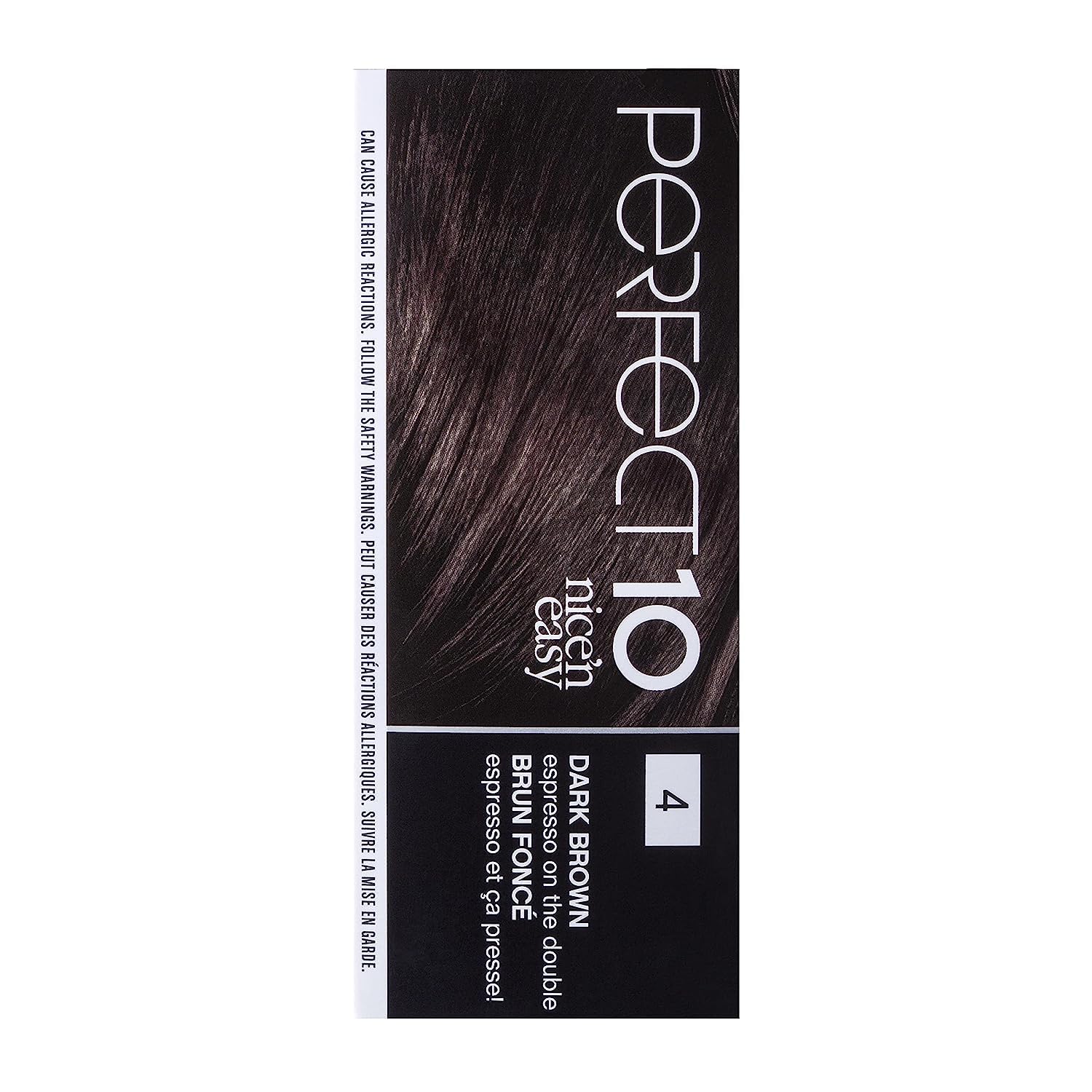 Product Description Experience perfection with the Clairol Nice ?n Easy Perfect 10 Permanent Dark Brown Hair Dye Kit. This complete kit comes with high gloss color cream, color blend activator, color seal conditioner, and expert gloves, making it nice ?n easy to give your hair the color boost of your dreams. All you need is ten quick minutes to get luscious color and gloss with the perfect balance of lightness, darkness, and tone. This dark brown hair dye is gentle on your hair and scalp, and best of all, it provides natural-looking coverage for up to 60 head-turning days. From the Manufacturer Perfect 10?s fast, flawless formula delivers expert-level color in just 10 minutes. Salon-inspired formula with shine-activating Micropearls gives you luxurious color and high-gloss color that lasts up to 60 days. An advanced color cr?me formula with Micropearls delivers color in less time and gives you high-gloss hair color with flawless gray coverage. This technology is the biggest advance in hair color in 50 years?it has 18 patents applied for and received the Royal Society of Chemistry Teamwork in Innovation Award. And it created the one and only Perfect 10. Knockout Color with Standout Shine Turn heads with Perfect 10?the high-gloss color that delivers expert-level results in just 10 minutes. This salon-inspired cr?me formula with shine-activating Micropearls drenches hair with luxurious color and shine that lasts up to 60 days. Permanent cr?me hair