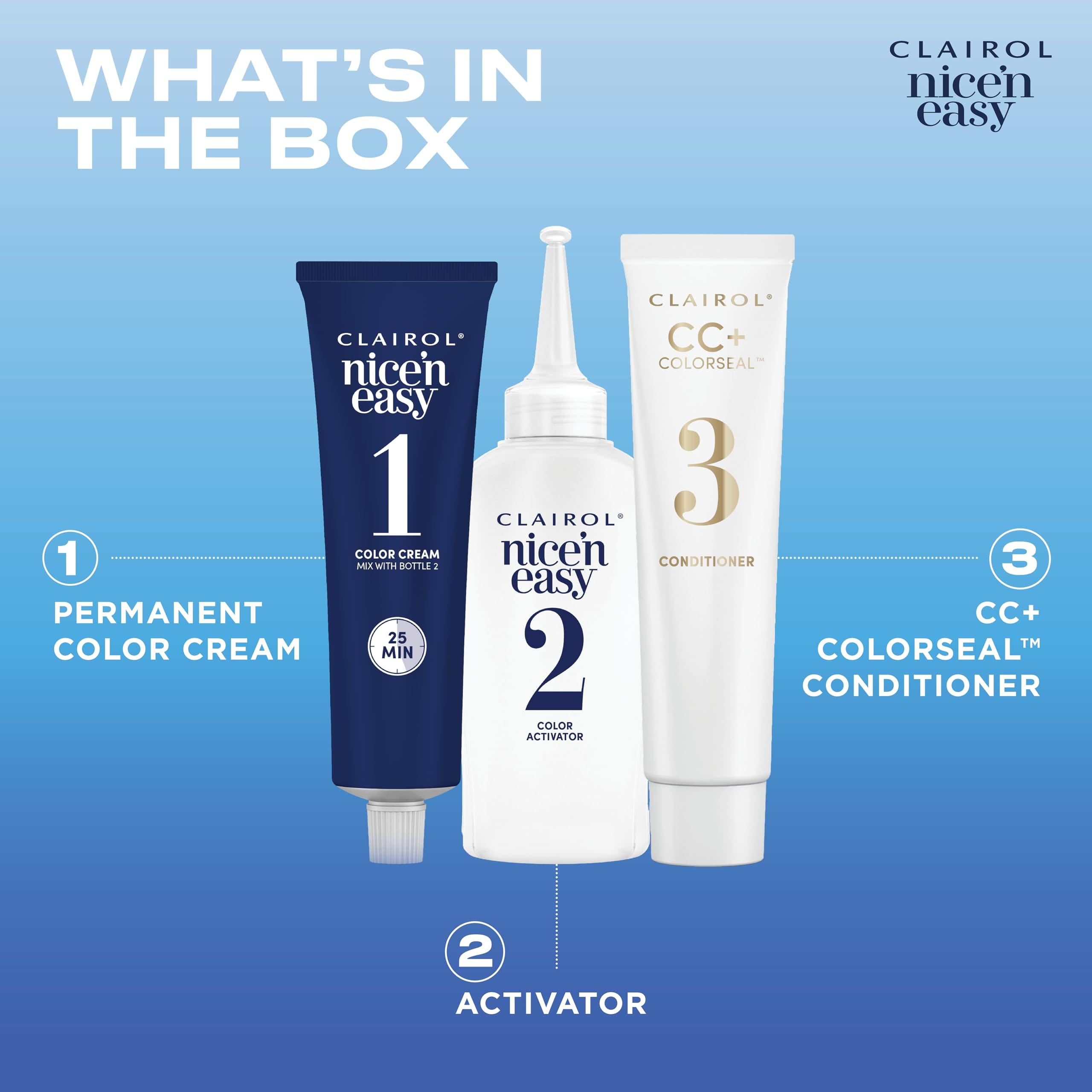 ? See instructions above. Tip: If your grays are really stubborn, it may be necessary to leave color on for up to 45 minutes. For Ultra Light Blonde shades, leave the color on for up to 45 minutes as well. Frequently Asked Questions Why is Nice ?n Easy hair color so amazing? Nice ?n Easy gives you ultimate natural-looking color by layering rich tones and contouring highlights in one simple step. Will it cover my grays? Yes! Nice ?n Easy promises 100% GRAY COVERAGE. For really resistant grays, try Nice ?n Easy Gray Solution?. How long will my color last? Nice ?n Easy lasts up to 8 weeks. And we’ve included our exclusive ColorSeal? Conditioning Gloss to help seal in beautiful, natural-looking color and add intense shine. How does it work? Our exclusive Color Blend Technology? gives you a pigment-