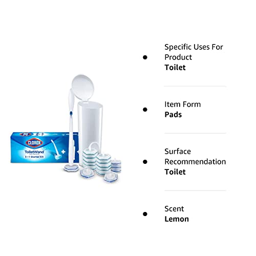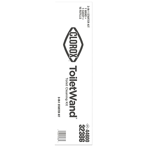 Clorox ToiletWand Disposable Toilet Cleaning System is a convenient way to a quick clean toilet. The starter kit contains one wand, 6 original refills, 10 Rainforest Rush scented refills and 1 storage caddy to get you started on a deeper clean. Each disposable head is preloaded with Clorox Cleaner with 4x the powerful scrubbing action to clean tough stains, kill germs, remove rust, calcium and limescale while it disinfects and deodorizes with ease. Based on comparative lab tests, the toilet wand cleans better than a brush. The sponge like cleaning head is shaped so that you can get into every nook and cranny while killing 99.9% of germs like staphylococcus aureus, salmonella enterica, rhinovirus type 37 and influenza A. This all in one system is designed so that you get a brand new cleaning sponge every time you clean without having to touch a yucky brush. Just click your way to a cleaner toilet with the Clorox ToiletWand Disposable Toilet Cleaning Starter Kit.