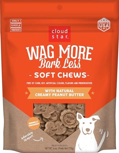 Make your dog happy with Cloud Star Wag More Bark Less Original Soft & Chewy Dog Treats. Made with simple ingredients and no artificial colors or flavors, you’ll feel good about these dog treats. Plus, we skip the fillers, dairy, corn, soy and white potatoes to leave room for healthy whole grain. These soft chew dog treats are oven baked here in the USA with a simple ingredient recipe. We focus on nutrition and flavor, so you can be sure your dog gets the nutrition he needs in a crave-able and mouth-watering dog biscuit. Each treat is shaped into an adorable smiling star, sun or cloud shape, making them fun to give and fun to eat. Reach for Cloud Star Wag More Bark Less Original Soft & Chewy Dog Treats and give your dog a reason to wag his tail.