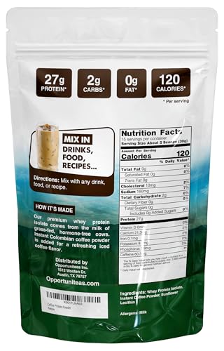 - COLOMBIAN COFFEE + PREMIUM PROTEIN – We combine dark roast Colombian coffee powder with premium whey protein isolate without any sweeteners or flavorings. Our whey protein starts as milk from grass-fed pasture raised cows from New Zealand. We use low-temperature processing to purify the protein and maximize the nutritional benefits.