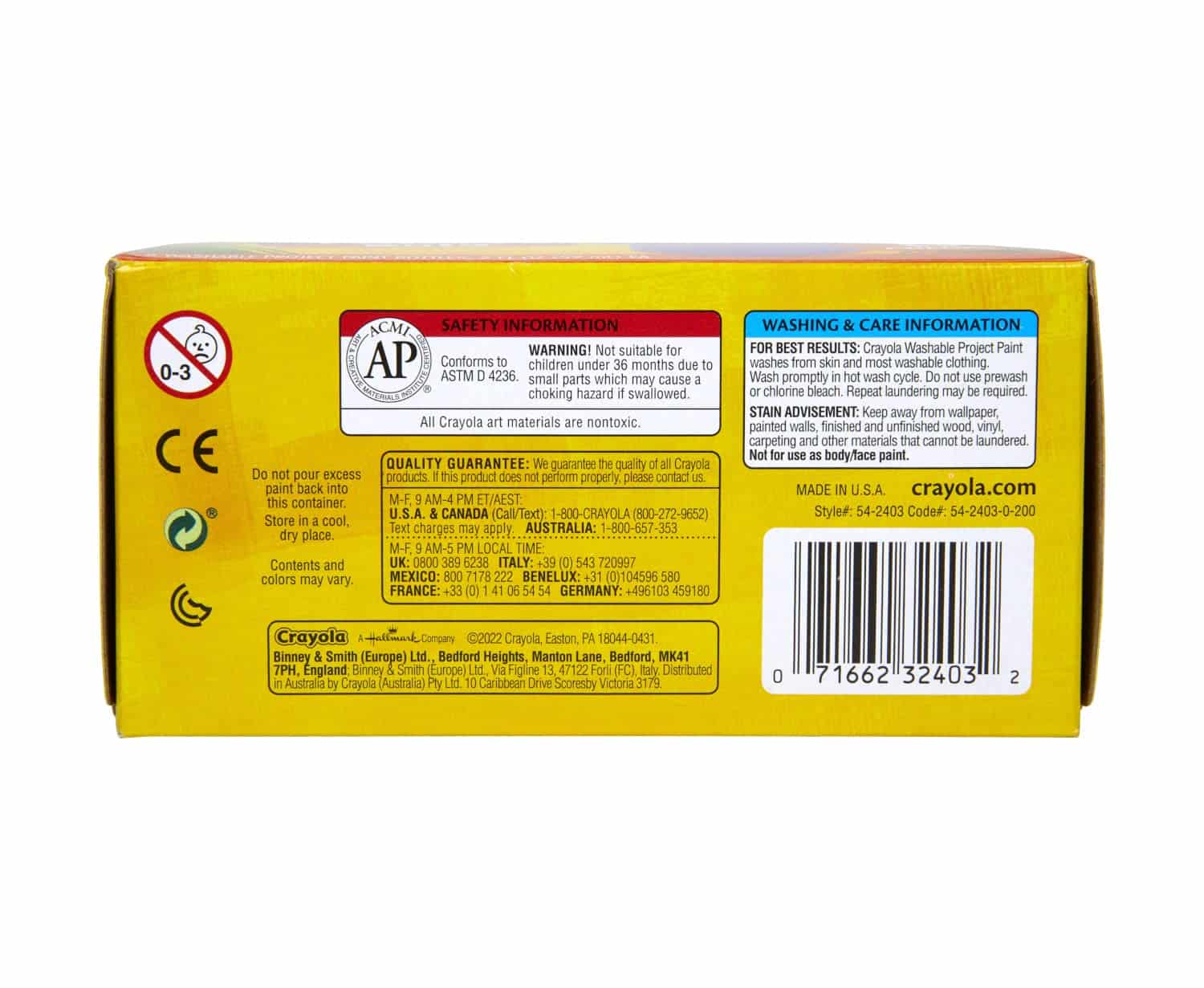 - CRAYOLA WASHABLE PROJECT PAINT: Washable paint in 6 bold colors including Yellow, Green, Yellow Orange, Red Orange, Fuchsia, Teal, and Blue Violet.