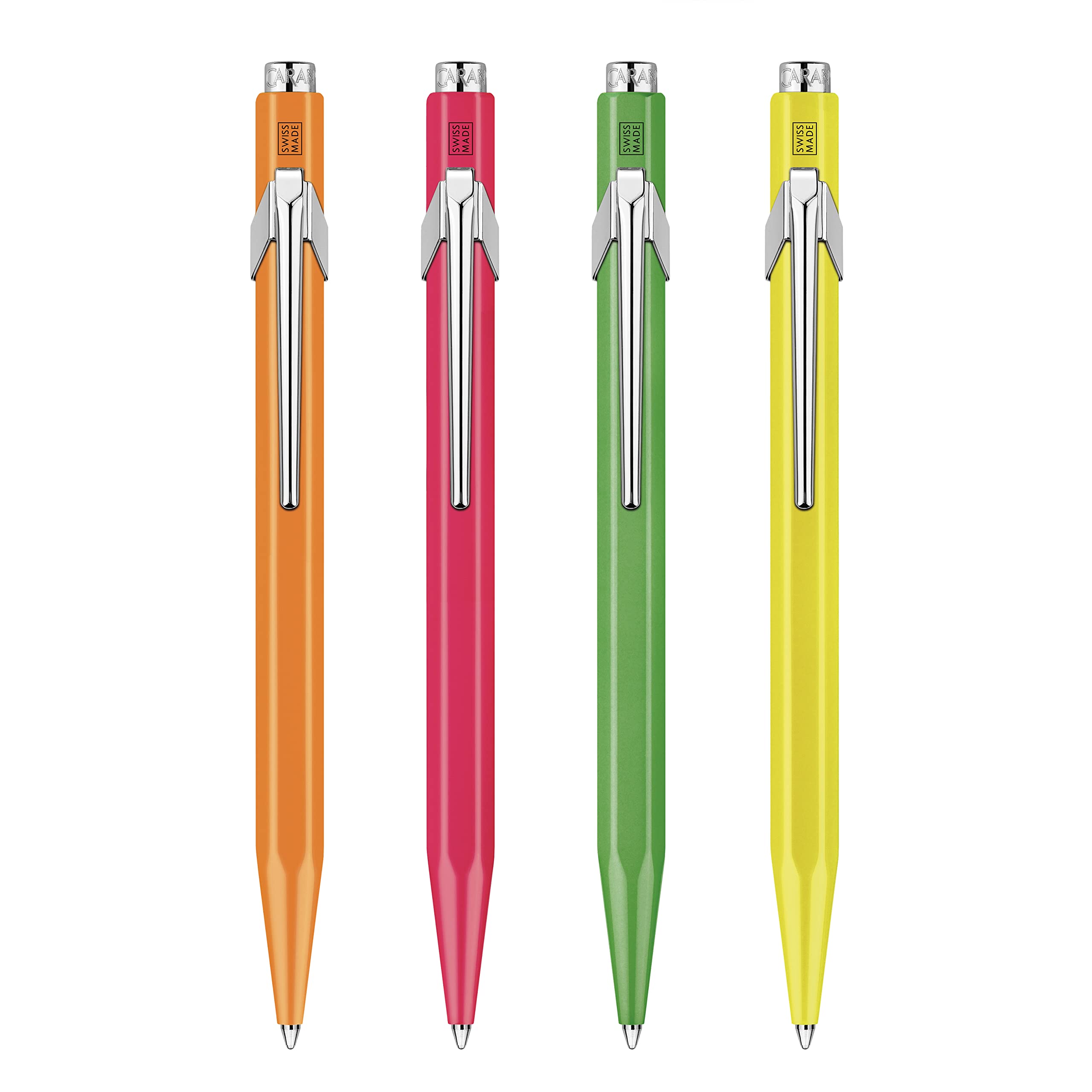 The classic Caran d’Ache ballpoint pen is stylish and practical with a light metal body and classic clip. Includes one Goliath medium ink cartridge with stainless-steel tip. Made in Switzerland. Fluorescent orange color.