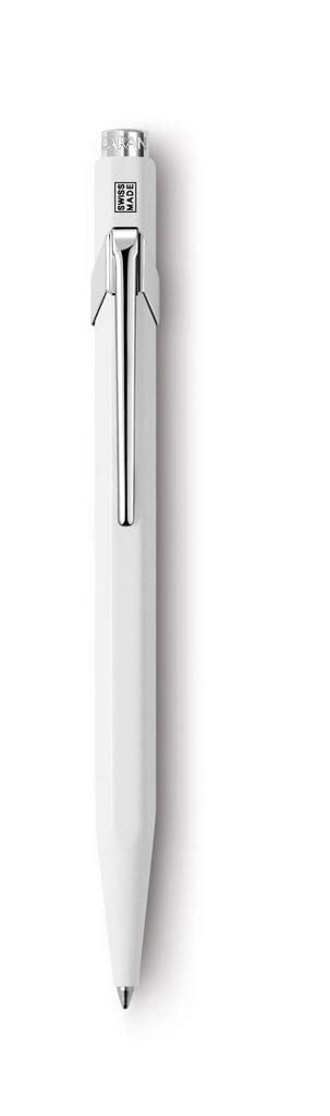 The Caran d’Ache ballpoint pen has a light metal body and classic clip. White. Includes one Goliath medium ink cartridge with stainless-steel tip.